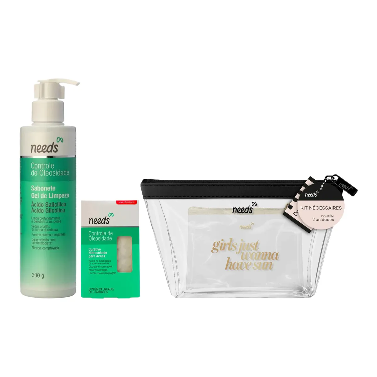 Kit Needs Controle de Oleosidade Gel de Limpeza Facial 300g + Curativo para Acne 24 Unidades + Nécessaires Transparente 2 Unidades