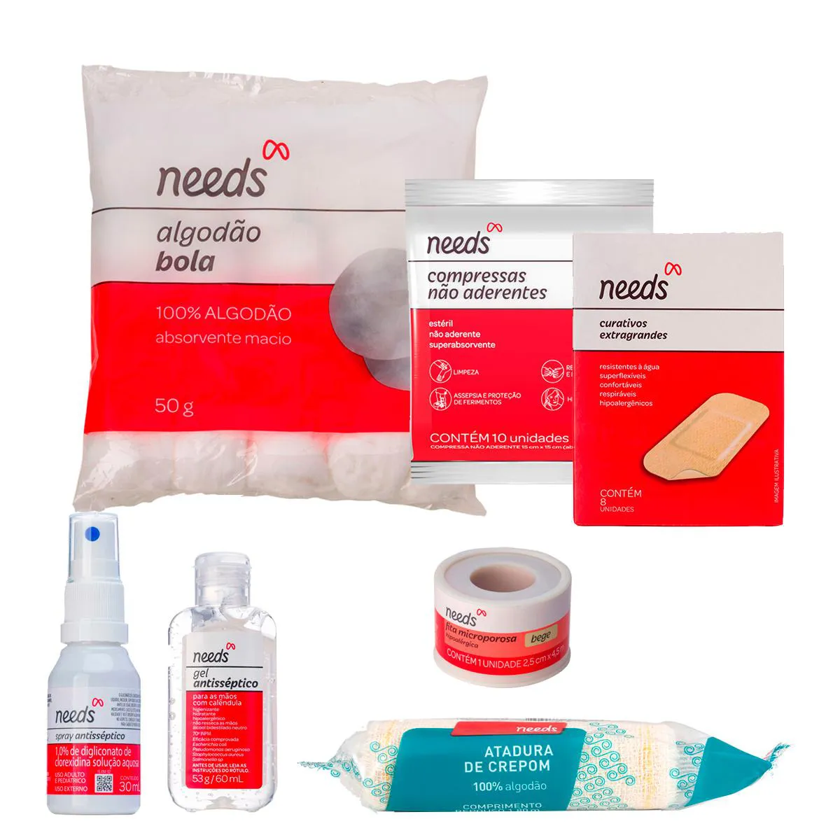 Kit Needs Primeiros Socorros Gaze + Atadura + Spray Antisséptico + Curativo + Fita Microporosa + Álcool em Gel + Algodão