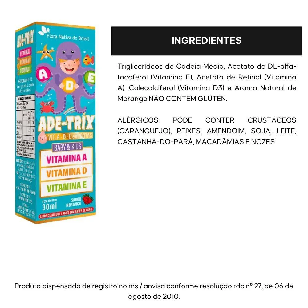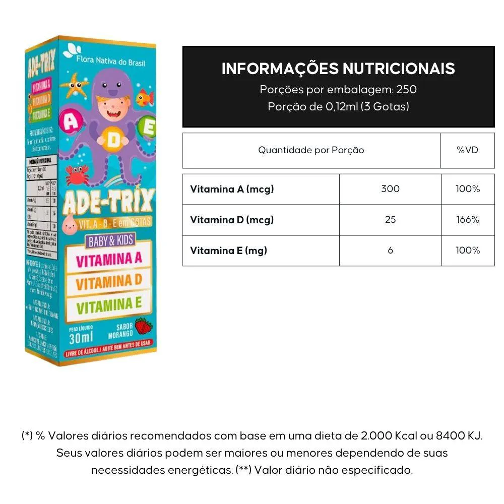 É um suplemento líquido com sabor de morango, contendo as vitaminas A, D e E, desenvolvido para auxiliar no aporte de nutrientes importantes para o funcionamento adequado do organismo.