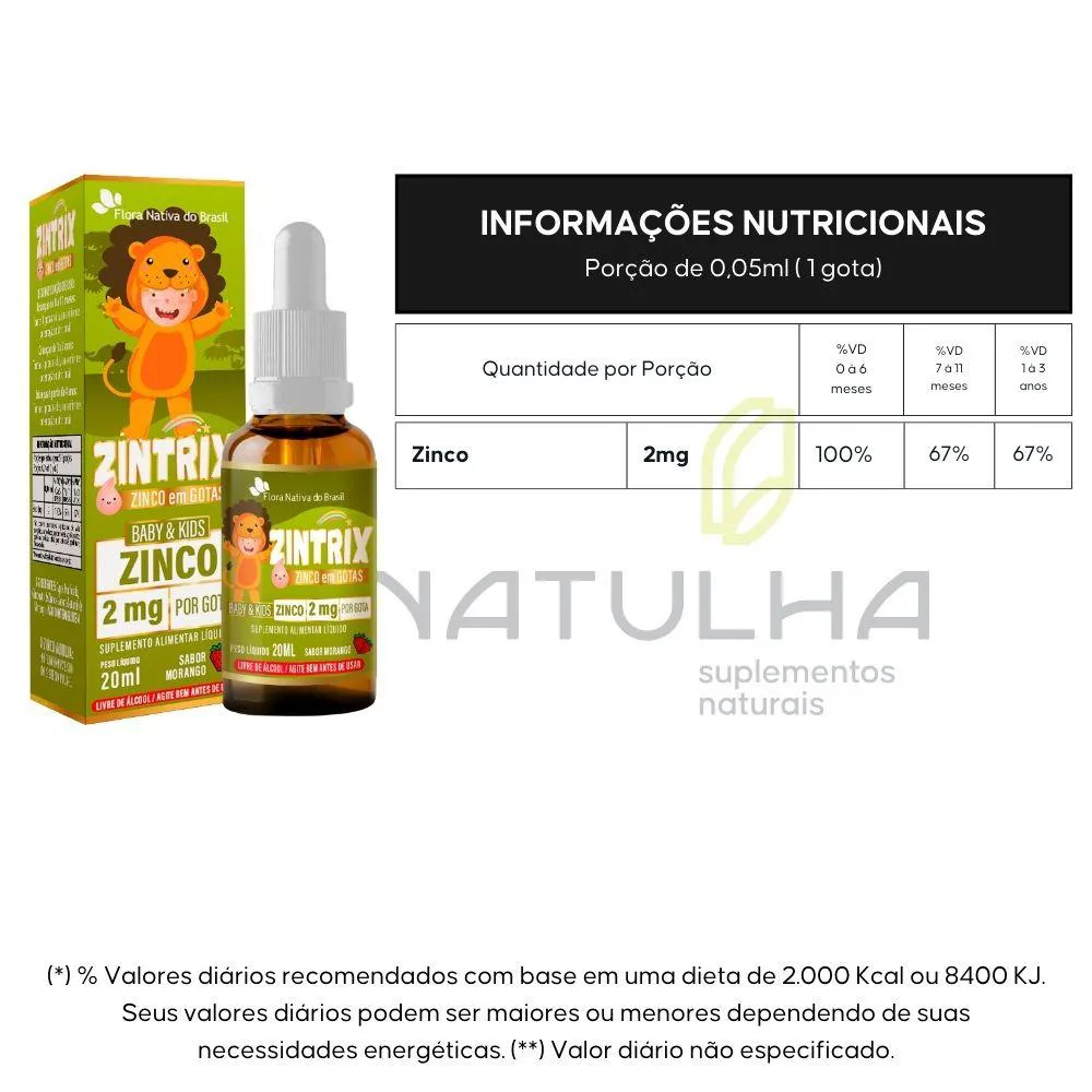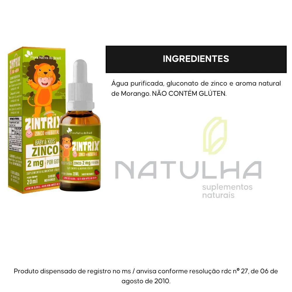 INGREDIENTES - ZINTRIX Água purificada, gluconato de zinco e aroma natural de Morango.NÃO CONTÉM GLÚTEN.