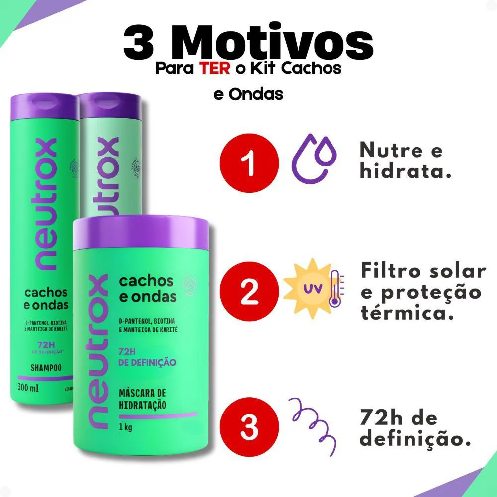 O Kit Neutrox Cachos e Ondas é um conjunto completo de produtos capilares desenvolvido especificamente para cabelos cacheados e ondulados, composto por shampoo, condicionador e máscara de hidratação.