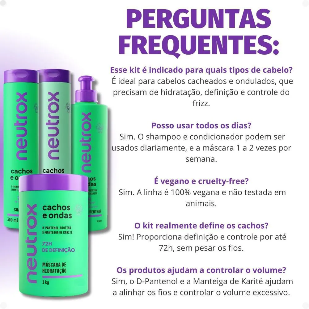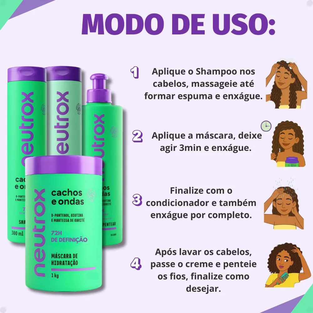 O Kit Neutrox Cachos e Ondas é ideal para o uso diário, proporcionando cuidados contínuos para manter a beleza e a saúde dos seus cachos e ondas. Perfeito para quem busca uma rotina capilar completa e eficaz, garantindo cabelos sempre bem cuidados e definidos. Use-o em casa para um tratamento eficaz, leve-o em viagens para não descuidar dos seus cachos, ou presenteie alguém especial com este kit que é um verdadeiro ritual de beleza capilar.Modo de Uso/Aplicação