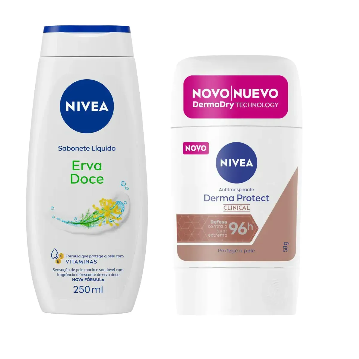 O Kit Nivea Desodorante Antitranspirante Stick Barra Derma Protect Clinical Feminino + Sabonete Líquido Erva Doce é composto por um desodorante antitranspirante em formato stick e um sabonete líquido corporal, ambos da marca Nivea. O desodorante Nivea Derma Protect Clinical oferece proteção máxima por até 96 horas contra o suor e o mau odor, graças à sua Tecnologia DermaDry, que cuida da pele sem causar irritações. Já o sabonete líquido Nivea Erva Doce limpa e hidrata a pele, deixando-a com uma fragrância refrescante de erva-doce.