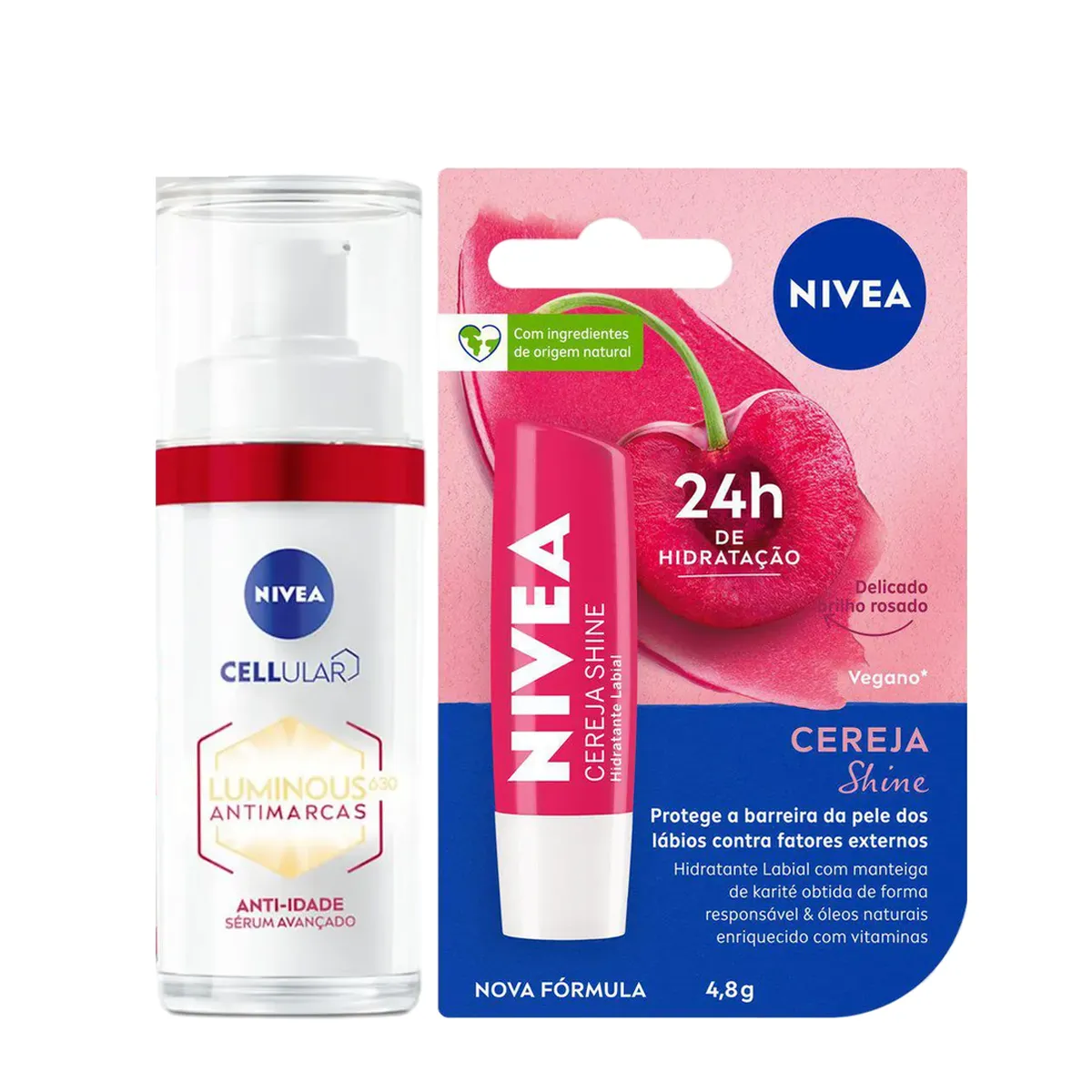 OKit Nivea Sérum Facial Cellular Luminous 630® Antimarcas Anti-idade + Hidratante Labial Cereja Shine é um conjunto de produtos desenvolvidos para reduzir marcas escurecidas causadas pela idade e hidratar intensivamente os lábios. O sérum facial contém ácido hialurônico e Luminous 630®, atuando em nível celular para preencher rugas, estimular a produção de colágeno, recuperar o volume e a firmeza da pele, uniformizando e iluminando o tom. Já o hidratante labial possui uma fórmula com óleos naturais, livre de óleo mineral, que desliza facilmente e uniformemente pelos lábios, proporcionando 24 horas de hidratação profunda com cor e brilho.
