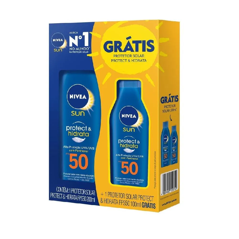 O produto é um conjunto de protetores solares da marca Nivea, composto por duas embalagens de diferentes volumes. O kit serve para proteger a pele contra os raios solares UV, oferecendo alta proteção com FPS 50, ao mesmo tempo em que hidrata a pele, proporcionando defesa solar e cuidado dérmico em uma única aplicação.