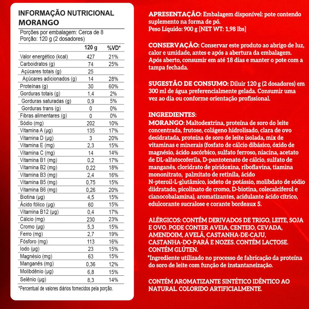 - Whey (morango): ideal no pós-treino ou como lanche proteico ao longo do dia.