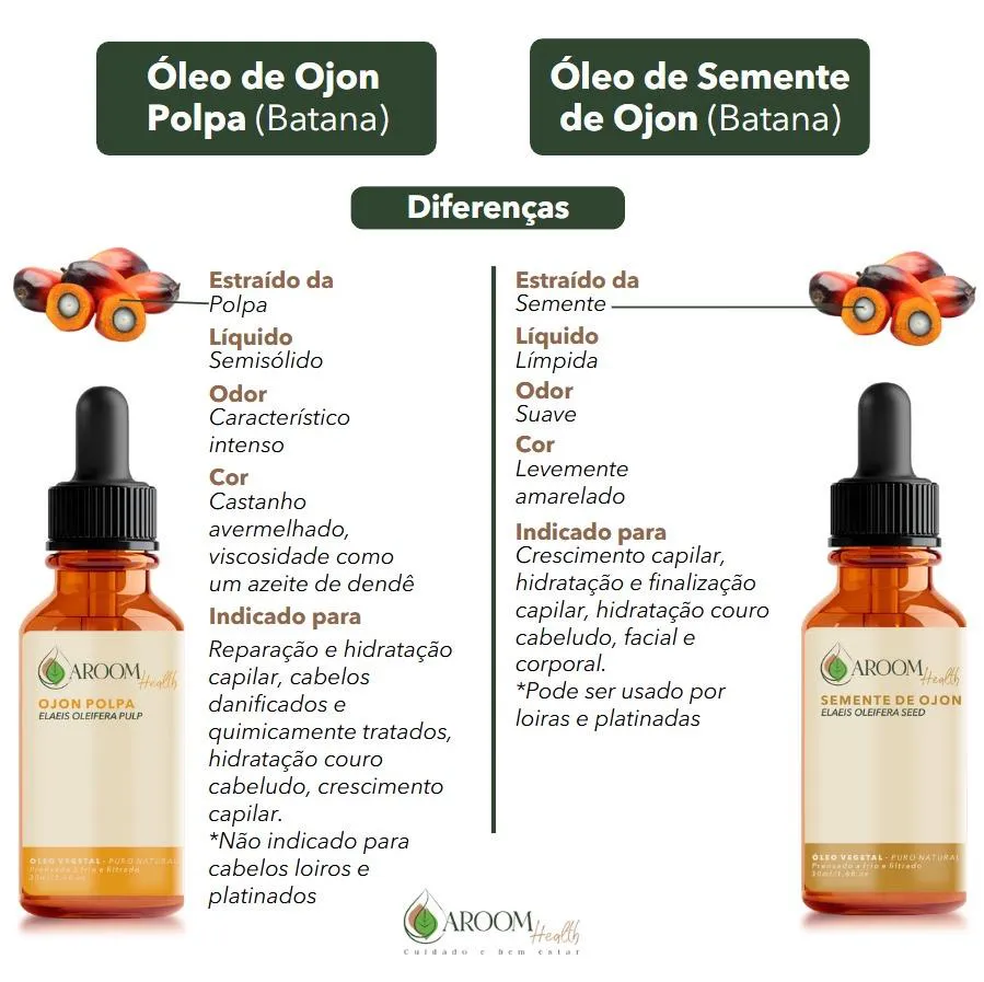 - Óleo vegetal semente de Ojon/Batana : Hidratação intensa e reconstrução dos fios. Rico em ácidos graxos e lipídios naturais que ajudam a restaurar a fibra capilar, combater pontas duplas e prevenir a quebra, pode ser usado em todos tipos de cabelos, inclusive Loiros e Platinados.
