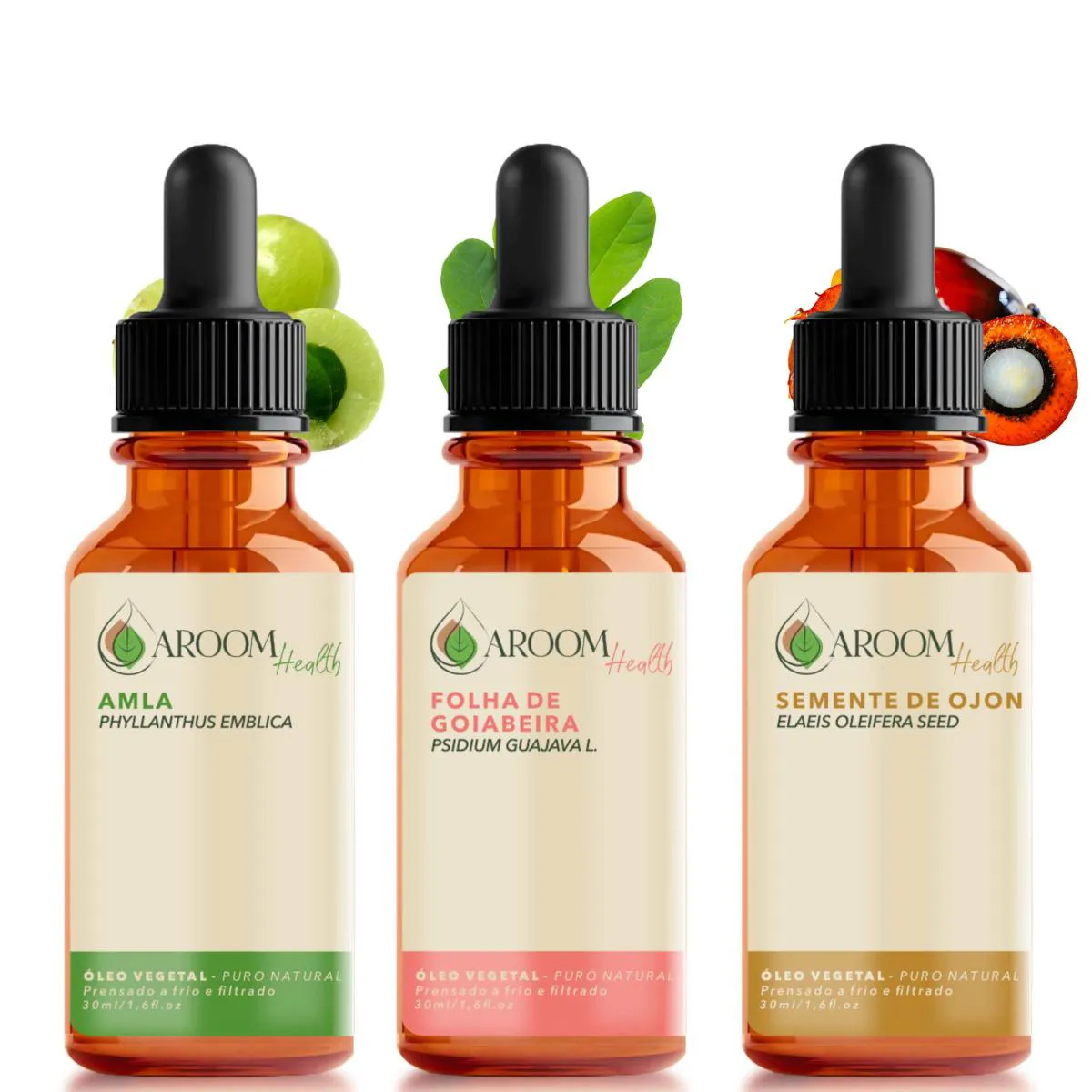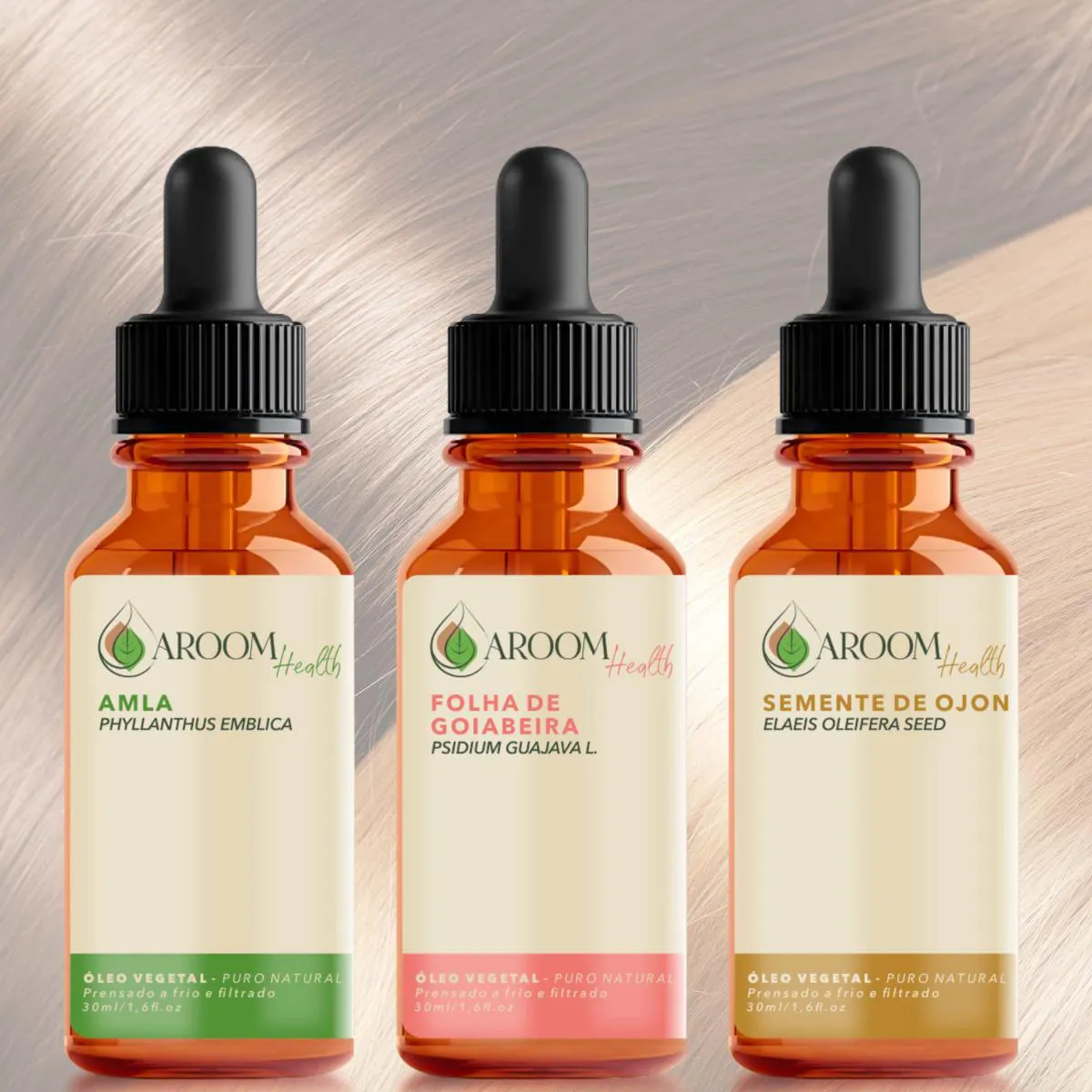 Kit óleos vegetais de Amla , folha da Goiabeira e semente de Ojon/Batana – 30 ml cada AroomHealth Conheça os benefícios dos óleos vegetais puro natural prensado a frio .Selecionados para o cuidado capilar este kit reúne três óleos poderosos óleos como Amla , folha da Goiabeira e semente de Ojon/Batana , auxiliam na queda capilar e crescimento saudável, hidratação profunda e brilho intenso.