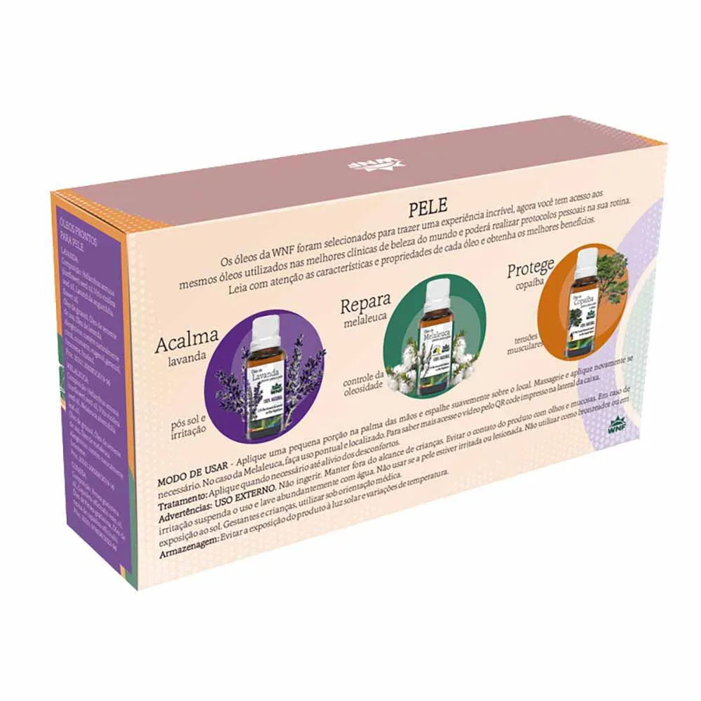 O Kit Óleos Vegetais WNF Pronto para a Pele é um conjunto de três óleos vegetais distintos (Lavanda, Melaleuca e Copaíba) prontos para uso, desenvolvidos para cuidados pessoais e tratamento da pele.