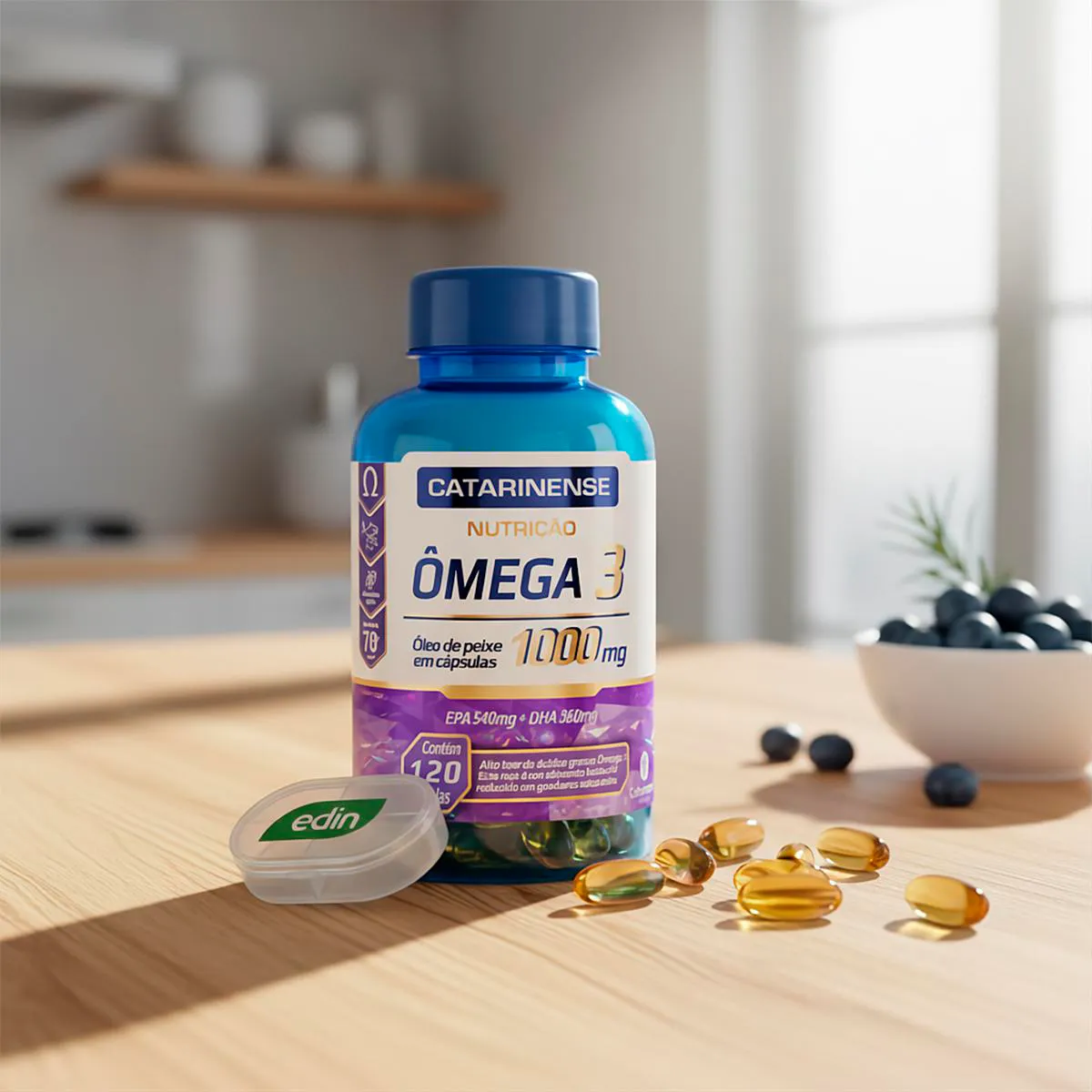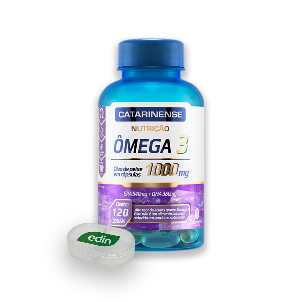 Ômega 3 1000mg Catarinense 120 Cápsulas + Porta Cápsulas Modo de consumo: Ingerir 1 cápsula, três vezes ao dia, preferencialmente antes das refeições, ou conforme orientação de profissional de saúde. Ingredientes: Óleo de peixe, água, gelificante gelatina e umectante glicerol. Alérgicos: contém derivados de peixe. Não contém glúten. Informações técnicas: Produto indicado para adultos a partir de 19 anos. Acompanha porta cápsulas. Este produto não é um medicamento. Não exceder a recomendação diária de consumo indicada na embalagem. Não deve ser consumido por gestantes, lactantes e crianças. Conservar na embalagem original, em local seco, fresco, ao abrigo da luz e umidade. Suplemento alimentar dispensado de registro conforme RDC nº 240/2018.