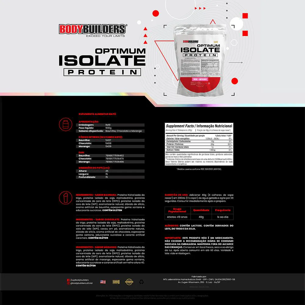KIT OPTIMUM ISOLATE WHEY PROTEIN 900G + THERMO START 100 CáPSULAS + GLUTAMINA 300G + COQUETELEIRA SABOR MORANGO - BODYBUILDERS