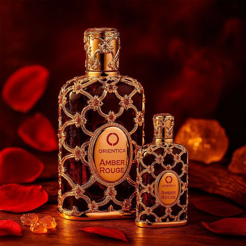 Amber Rouge abre com açafrão picante e jasmim floral, evoluindo para um coração quente de âmbar cinzento e madeira de âmbar, finalizando com cedro e resina de abeto para um toque amadeirado. Fixação de 6-8h com projeção moderada (1-2h), ideal para eventos noturnos. A miniatura de 7,5ml é prática para viagens ou bolsas. Vegano e cruelty-free, reflete a qualidade premium da Orientica. Avaliações destacam semelhança com fragrâncias de nicho, mas alguns usuários relatam projeção inconsistente em lotes específicos, sugerindo compra em varejistas confiáveis.