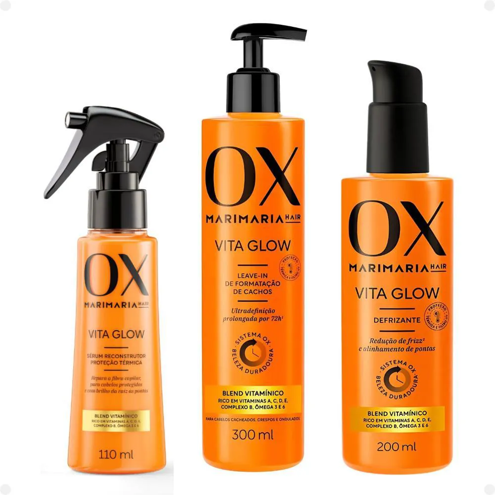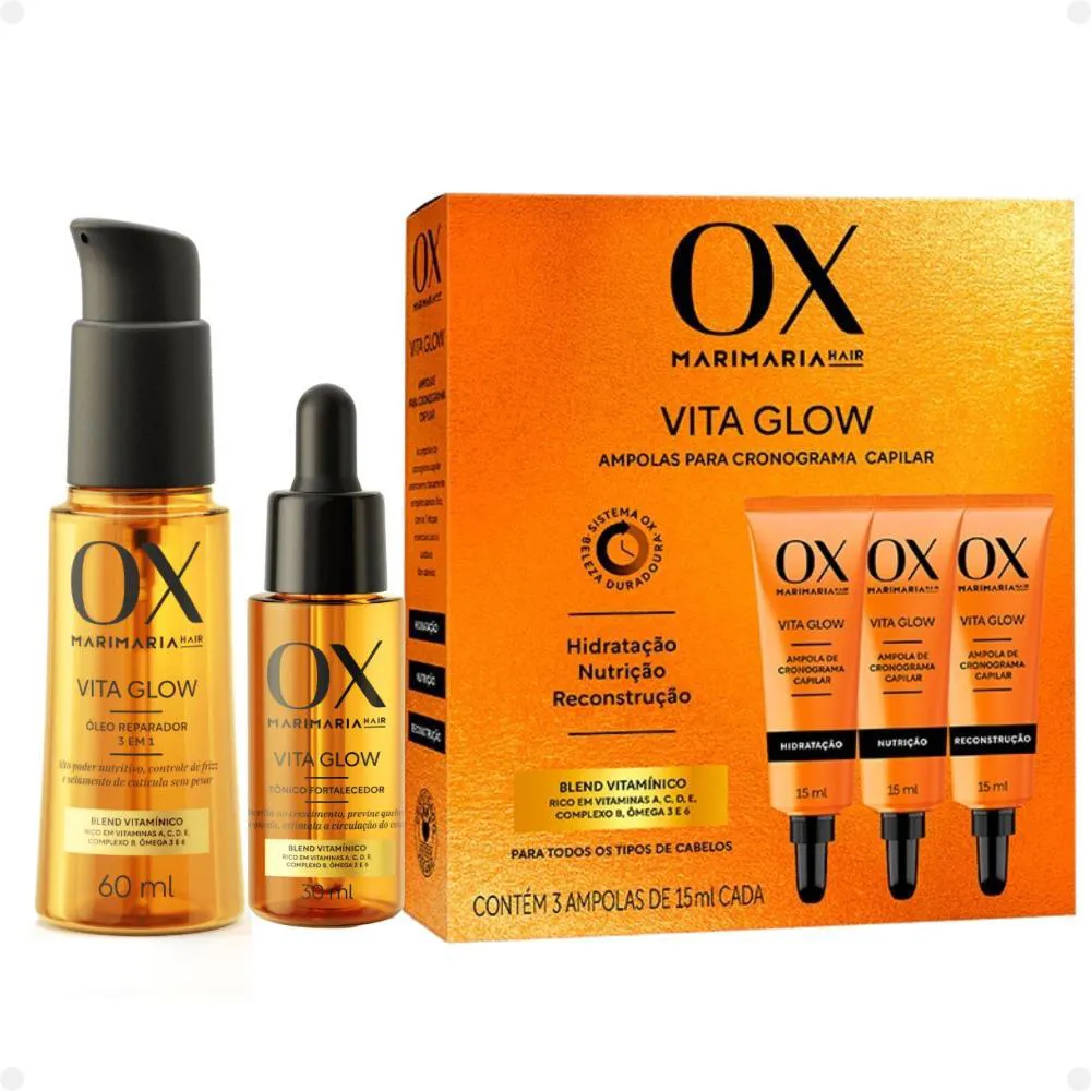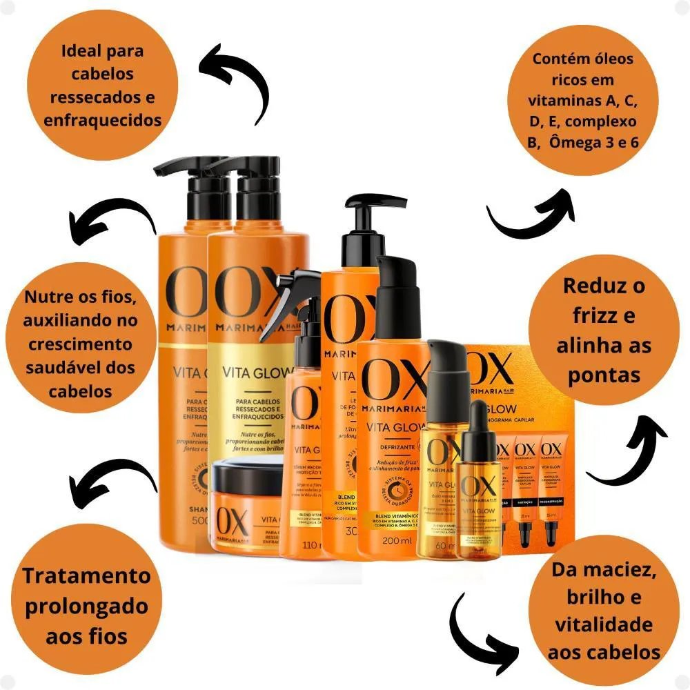Kit Ox Mari Maria Hair Vita Glow: Shampoo, Condicionador, Máscara, Ampola, Sérum, Leave-in, Defrizante, Óleo e Tônico