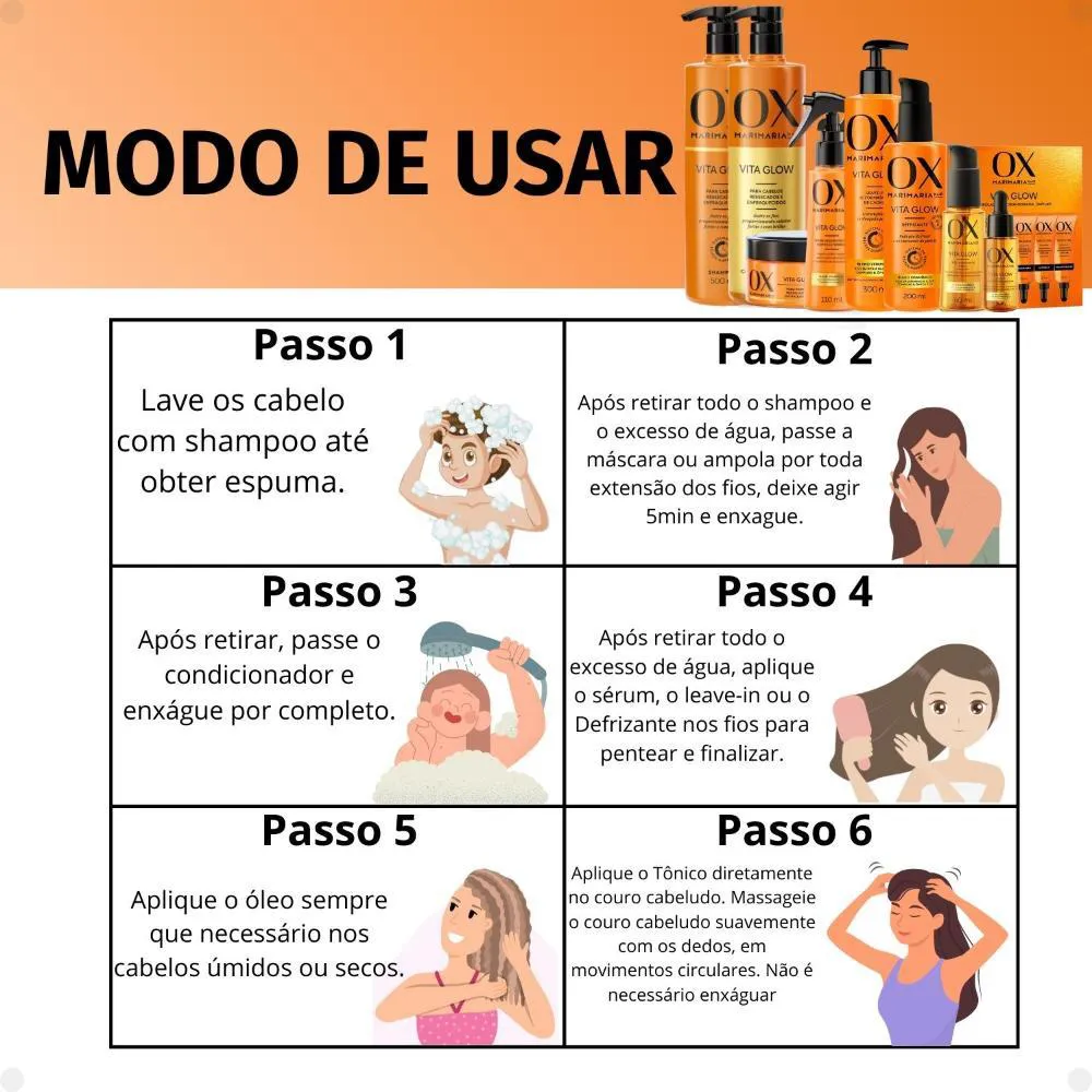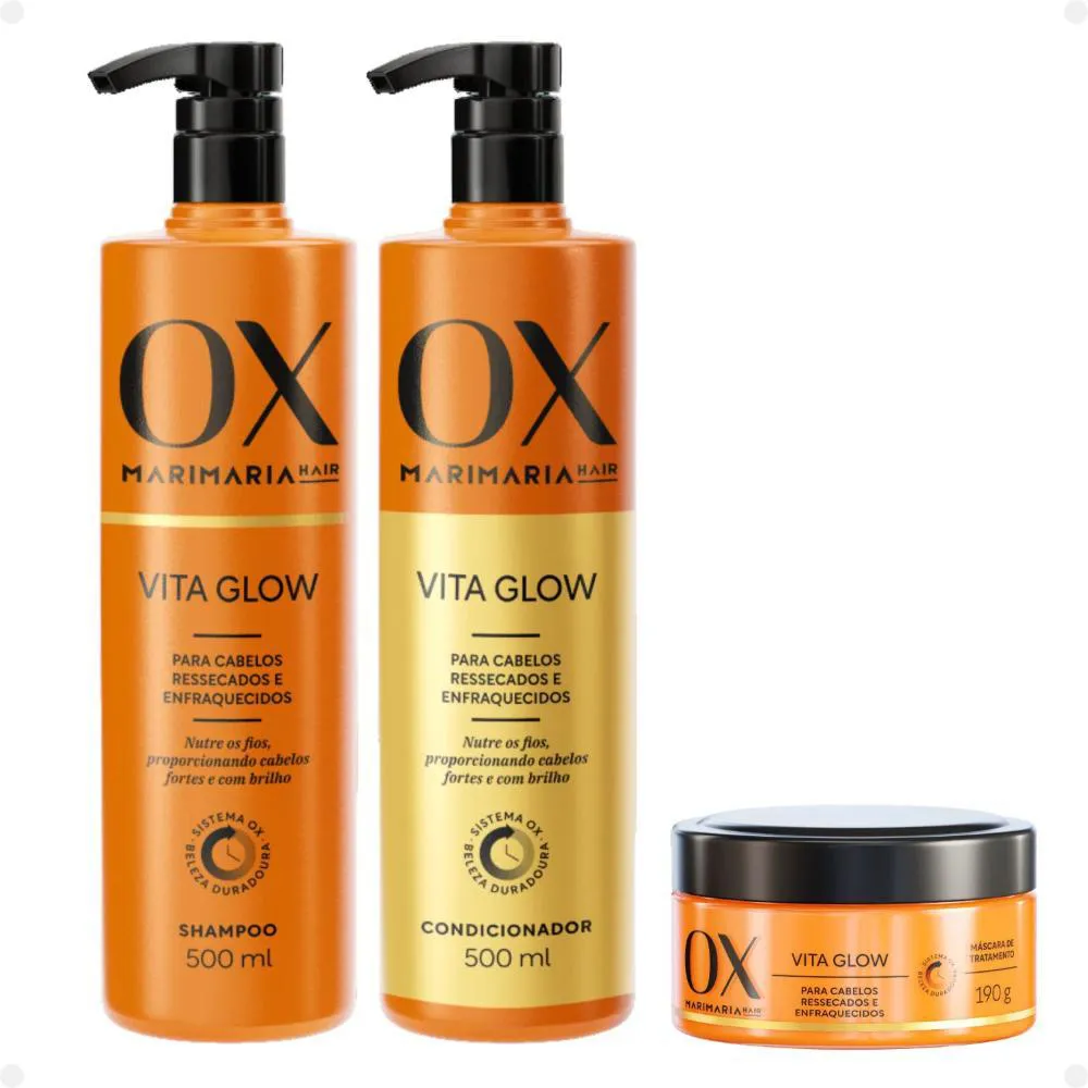 Contém: - 01 shampoo Mari Maria Hair Ox Vita Glow 500ml. - 01 condicionador Mari Maria Hair Ox Vita Glow 500ml. - 01 máscara de Tratamento Mari Maria Hair Ox Vita Glow 190g. - 01 Kit Ampolas Cronograma Capilar Mari Maria Hair Ox Vita Glow. - 01 Sérum Reconstrutor Mari Maria Hair Ox Vita Glow 110ml. - 01 Leave-In de Formatação de Cachos Ox Mari Maria Hair Vita Glow 300ml. - 01 Defrizante Mari Maria Hair Ox Vita Glow 200ml. - 01 Óleo Reparador 3 em 1 Mari Maria Hair Ox Vita Glow 60ml. - 01 Tônico Fortalecedor Mari Maria Hair Ox Vita Glow 30ml. . Kit Mari Maria Hair Vita Glow A Linha MARI MARIA HAIR VITA GLOW é a ideal para cabelos ressecados e enfraquecidos. Isso porque a combinação do blend de óleos ricos em vitaminas* A, C, D, E, complexo B, ômega 3 e 6 com o Sistema OX beleza Duradoura, é a fórmula certa para nutrir os fios auxiliando no crescimento saudável dos cabelos. Sistema OX Beleza Duradoura: É uma tecnologia exclusiva, capaz de liberar sequencialmente os ingredientes, proporcionando um tratamento prolongado aos fios. . Modo de Uso Shampoo: Aplique o Shampoo nos cabelos molhados massageando-os por alguns minutos. Enxágue e repita a aplicação. Condicionador: Após lavar o cabelo com Shampoo, aplique o Condicionador nos cabelos ainda molhados do comprimentos às pontas. Deixe agir por alguns minutos e, em seguida enxágue. Máscara: Após o uso do Shampoo, aplique a Máscara mecha a mecha deixe agir por 5 minutos e enxágue. Ampola: Após o uso do shampoo, aplique a ampola de tratamento de acordo a necessidade do fio, mecha a mecha, deixe agir por 3 minutos e enxágue. Sérum: Utilize nos cabelos úmidos antes do uso de ferramentas de calor. Leave-In: Após lavar e condicionar os cabelos, retire o excesso de água e aplique uma quantidade equivalente a uma moeda por mecha do Leave-In por toda a extensão dos fios. Amasse-os iniciando o movimento das pontas até a raiz para ativar a formação dos cachos. Defrizante: Aplique o Defrizante no comprimento e pontas dos fios, úmidos ou secos para realizar o controle do frizz e selamento de pontas. Pode ser utilizado como protetor térmico antes de ferramentas de calor. Óleo: Aplique o produto sempre que necessário nos cabelos úmidos ou secos. Não é necessário enxáguar. Tônico: Agite antes de usar. Com os cabelos úmidos ou secos, aplique o Tônico diretamente no couro cabeludo. Massageie o couro cabeludo suavemente com os dedos, em movimentos circulares. Não é necessário enxáguar. . Código de Registro Sanitário (ANVISA) Shampoo: 25351.405227/2023-93 Condicionador: 25351.405208/2023-67 Máscara: 25351.405047/2023-10 Ampola: 25351.363281/2024-35 Sérum: 25351.401856/2023-44 Leave-In: 25351.363295/2024-59 Defrizante: 25351.363385/2024-40 Óleo: 25351.402042/2023-27 Tônico: 25351.405129/2023-56