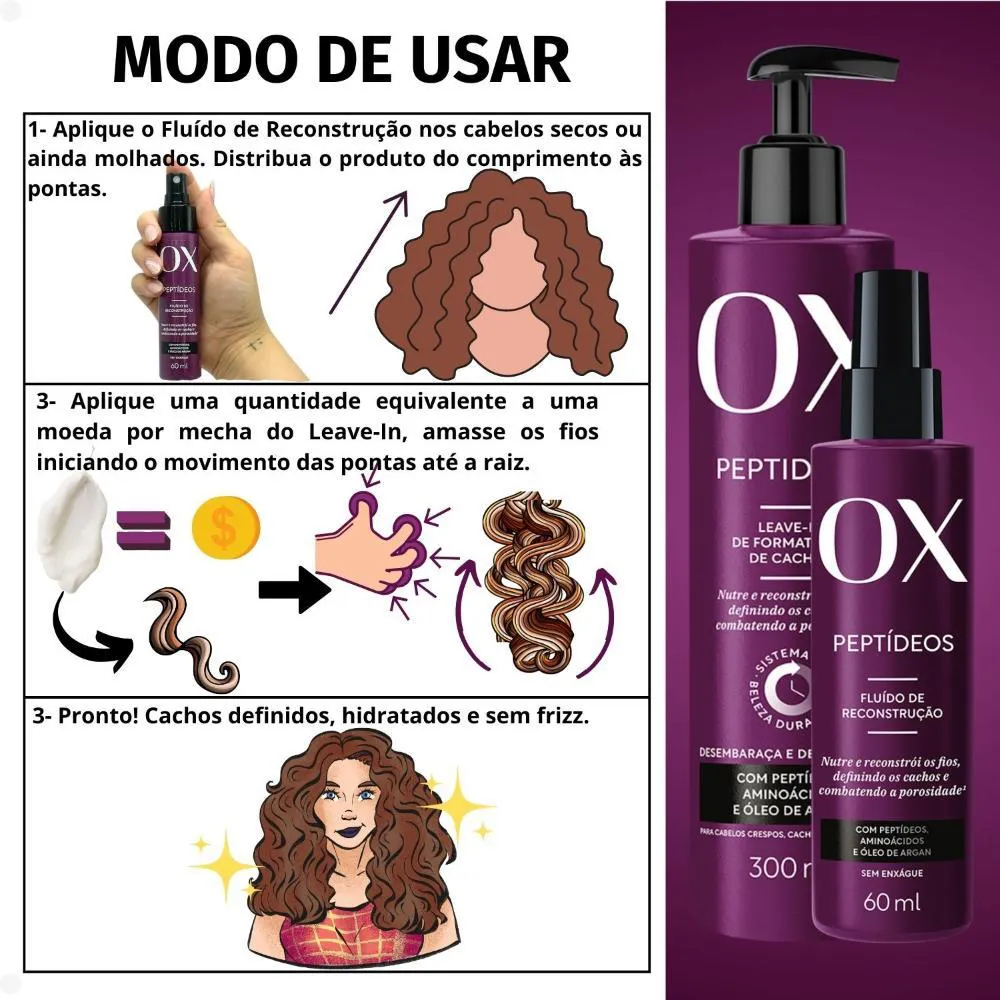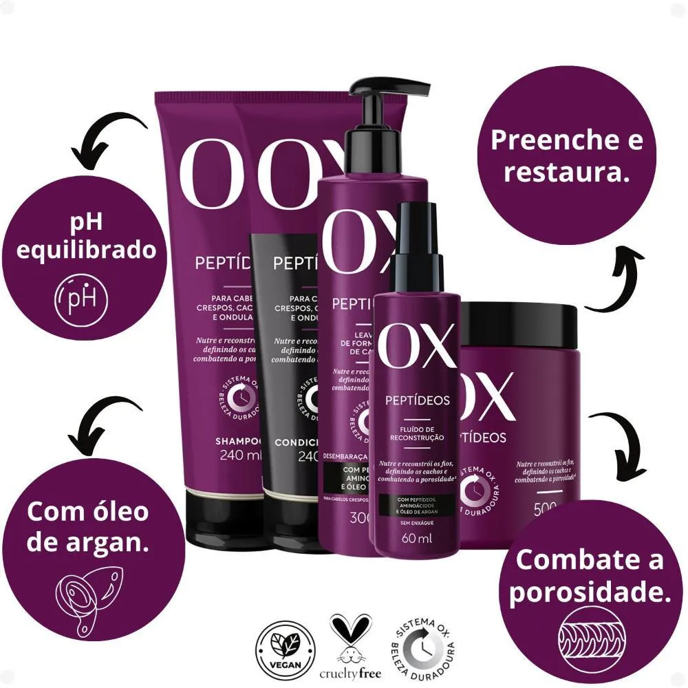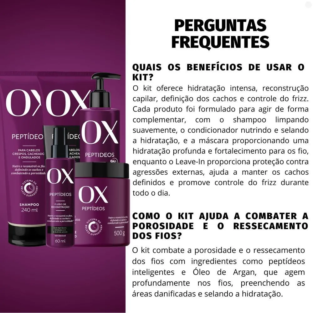 Kit OX Peptídeos Cabelos Crespos, Cacheados e Ondulados Contém: 01 shampoo OX Peptídeos Cabelos Crespos, Cacheados e Ondulados 240ml 01 condicionador OX Peptídeos Cabelos Crespos, Cacheados e Ondulados 240ml 01 máscara de Tratamento OX Peptídeos Cabelos Crespos, Cacheados e Ondulados 500g 01 Leave-In Formatação de Cachos Ox Peptídeos Cabelos Crespos, Cacheados e Ondulados 300ml 01 Fluído de Reconstrução OX Peptídeos Cabelos Crespos, Cacheados e Ondulados 300ml . O Kit OX Peptídeos foi desenvolvido para proporcionar cuidados completos aos cabelos crespos, cacheados e ondulados. Com Shampoo, Condicionador, Máscara de Tratamento, Leave-in e Fluído de Reconstrução, ele hidrata, define, fortalece e recupera os fios danificados, oferecendo brilho, maciez e controle de frizz. O shampoo limpa suavemente e prepara os fios para o tratamento. O condicionador hidrata e desembaraça, promovendo maciez e proteção. A máscara de tratamento Proporciona hidratação profunda e recuperação dos fios. O leave-in Define e controla o frizz, deixando os cachos mais bonitos e hidratados. O fluído de reconstrução Restaura a fibra capilar e previne danos futuros, promovendo força e brilho. Com esse kit, seus cabelos crespos, cacheados e ondulados ganham o cuidado completo para ficarem saudáveis, definidos e cheios de vida. . Benefícios: Hidratação e definição dos cachos Reconstrução e fortalecimento capilar Controle de frizz e brilho intenso . Modo de Uso: Aplique nos cabelos molhados, massageie o couro cabeludo e os fios até formar espuma. Enxágue bem. Se necessário, repita a aplicação. Após enxaguar o shampoo, aplique a máscara nos cabelos úmidos, do comprimento às pontas. Deixe agir por 10 a 15 minutos e enxágue bem. Aplique o condicionador após a máscara, distribuindo nos fios úmidos para selar a hidratação. Deixe agir por alguns minutos e enxágue bem. Após enxaguar o condicionador, aplique o fluído de reconstrução nos cabelos úmidos, principalmente nas áreas mais danificadas. Não enxágue. Penteie e deixe secar naturalmente ou use um secador. Após o uso do fluído, aplique o leave-in nos cabelos úmidos, distribuindo uniformemente para definir e modelar os cachos. Não enxágue e deixe secar naturalmente ou utilize um secador com difusor para maior definição. Precauções: Manter fora do alcance de crianças. Uso externo. Uso não recomendado para pessoas sensíveis a qualquer componente da formulação. Manter ao abrigo da luz solar, em local fresco e seco. Havendo irritação, suspenda o uso imediatamente e procure orientação médica. Em caso de contato com os olhos, lavar com água abundantemente. . Perguntas Frequentes O Shampoo OX Peptídeos é liberado para low poo e no poo? Sim, o Shampoo OX Peptídeos é liberado para quem segue as técnicas de low poo e no poo, pois é livre de sulfatos agressivos e ingredientes que possam danificar os fios. Posso usar o Fluído de Reconstrução no lugar do Leave-in? Não é recomendado. O Fluído de Reconstrução é um tratamento intensivo que deve ser usado após a máscara e antes do leave-in, que tem a função de modelar e definir os cachos. Como posso potencializar os resultados do Kit OX Peptídeos? Para resultados ainda melhores, recomendamos o uso do kit completo de maneira contínua, aliado ao uso de uma touca térmica ou capinha de hidratação durante o uso da máscara, para um efeito mais profundo. . Código de Registro Sanitário (ANVISA) Shampoo: 25351.376765/2024-44 Condicionador: 25351.376778/2024-13 Máscara: 25351.412696/2024-40 Leave-in: 25351.412574/2024-53 Fluído de Reconstrução: 25351.4123952/2024-16