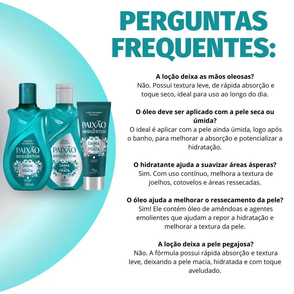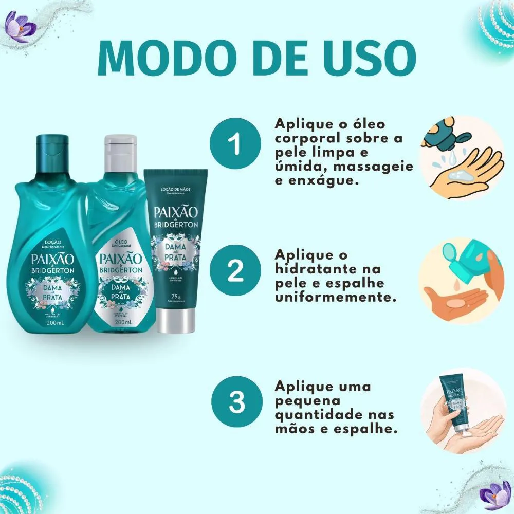 Kit Paixão Bridgerton Dama de Prata: Loção Hidratante, Óleo Corporal 200ml e Loção Hidratante de mãos 75g