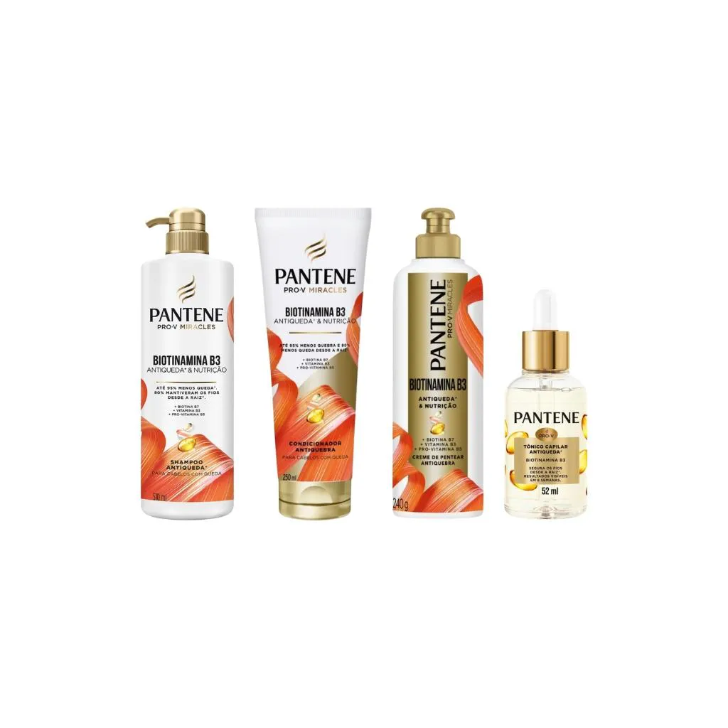 Esse kit contém: 1 shampoo Pantene 510ml Pump Biotinamina B3, 1 condicionador Pantene 250ml Biotinamina, 1 Creme Para Pentear Pantene 240g Biotinamina e 1 Tonico Capilar Pantene 52ml Biotinamina. Descrição O Shampoo Pantene Biotinamina B3 510ml com pump é ideal para quem busca cabelos mais fortes, nutridos e com menos queda por quebra*. Sua fórmula exclusiva é enriquecida com um complexo multivitamínico poderoso: Biotina B7, vitamina B3 e Pró-Vitamina B5. Juntas, essas vitaminas fortalecem os fios desde a raiz°, proporcionando hidratação, brilho e uma limpeza suave e eficaz. O Condicionador Pantene Biotinamina B3 Antiquebra 250ml é a escolha ideal para cabelos fracos e quebradiços. Sua fórmula avançada combina Biotina B7, Vitamina B3 e Pró-Vitamina B5 para proporcionar nutrição profunda, fortalecer os fios desde a raiz e reduzir a queda por quebra em até 95%⁺. O Creme para Pentear Pantene Biotinamina B3 Fortalecedor 240g faz parte da linha Antiqueda⁺ e foi desenvolvido para fortalecer os cabelos desde a raiz até as pontas, proporcionando fios mais fortes, definidos, macios e livres de frizz. Sua fórmula exclusiva combina Biotina B7, Vitamina B3 e Pró-Vitamina B5 — um verdadeiro complexo vitamínico que revitaliza e nutre profundamente os fios. O Tônico Capilar Pantene Biotinamina 52ml faz parte da linha Antiqueda⁺ e foi desenvolvido para fortalecer os fios desde a raiz e ajudar a reduzir a queda por quebra em até 95%⁺. Sua fórmula avançada combina Vitamina B3, Biotina B7, Pró-Vitamina B5 e cafeína, ingredientes poderosos que proporcionam uma dose diária de nutrição e energia para o couro cabeludo. Estimula o crescimento saudável, revitaliza a fibra capilar e contribui para cabelos mais fortes e resistentes. Tecnologia clinicamente comprovada com resultados visíveis em 8 semanas°.