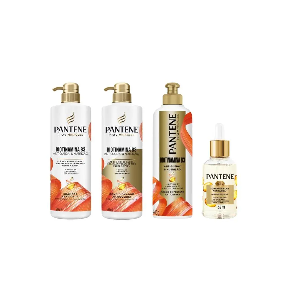 Esse kit contém: 1 shampoo Pantene 510ml Pump Biotinamina B3, 1 condicionador Pantene 510ml Biotinamina, 1 Creme Para Pentear Pantene 240g Biotinamina e 1 Tonico Capilar Pantene 52ml Biotinamina. Descrição O Shampoo Pantene Biotinamina B3 510ml com pump é ideal para quem busca cabelos mais fortes, nutridos e com menos queda por quebra*. Sua fórmula exclusiva é enriquecida com um complexo multivitamínico poderoso: Biotina B7, vitamina B3 e Pró-Vitamina B5. Juntas, essas vitaminas fortalecem os fios desde a raiz°, proporcionando hidratação, brilho e uma limpeza suave e eficaz. O Condicionador Pantene Biotinamina B3 510ml é a escolha ideal para cabelos fracos, quebradiços e com tendência à queda. Sua fórmula avançada combina Biotina B7, Vitamina B3 e Pró-Vitamina B5, proporcionando nutrição profunda e fortalecimento dos fios desde a raiz até as pontas. Desenvolvido para reduzir a queda capilar por quebra em até 95%*, hidrata intensamente e melhora visivelmente a saúde dos cabelos. O Creme para Pentear Pantene Biotinamina B3 Fortalecedor 240g faz parte da linha Antiqueda⁺ e foi desenvolvido para fortalecer os cabelos desde a raiz até as pontas, proporcionando fios mais fortes, definidos, macios e livres de frizz. Sua fórmula exclusiva combina Biotina B7, Vitamina B3 e Pró-Vitamina B5 — um verdadeiro complexo vitamínico que revitaliza e nutre profundamente os fios. O Tônico Capilar Pantene Biotinamina 52ml faz parte da linha Antiqueda⁺ e foi desenvolvido para fortalecer os fios desde a raiz e ajudar a reduzir a queda por quebra em até 95%⁺. Sua fórmula avançada combina Vitamina B3, Biotina B7, Pró-Vitamina B5 e cafeína, ingredientes poderosos que proporcionam uma dose diária de nutrição e energia para o couro cabeludo. Estimula o crescimento saudável, revitaliza a fibra capilar e contribui para cabelos mais fortes e resistentes. Tecnologia clinicamente comprovada com resultados visíveis em 8 semanas°.