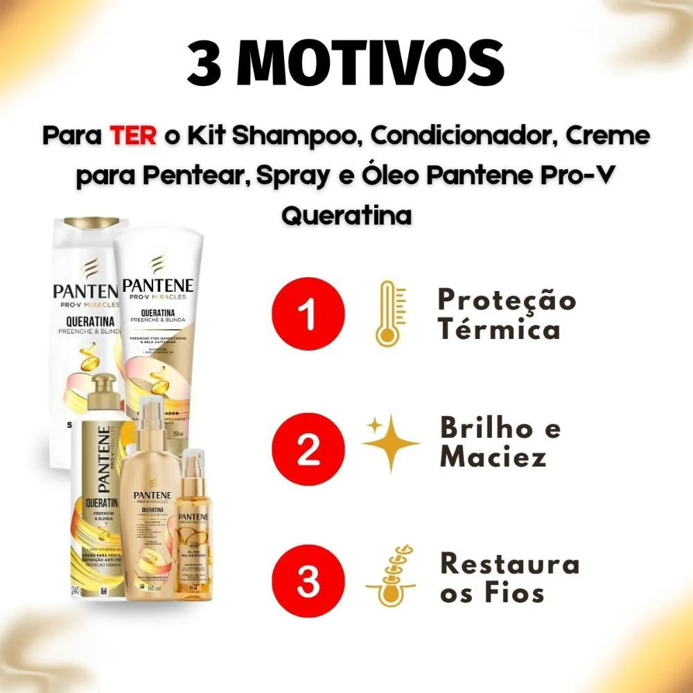 Kit Pantene Pro-V Queratina: Shampoo 300Ml, Condicionador 250Ml, Creme para Pentear 240G, Spray Multibenefícios 160Ml e Óleo Capilar 95Ml