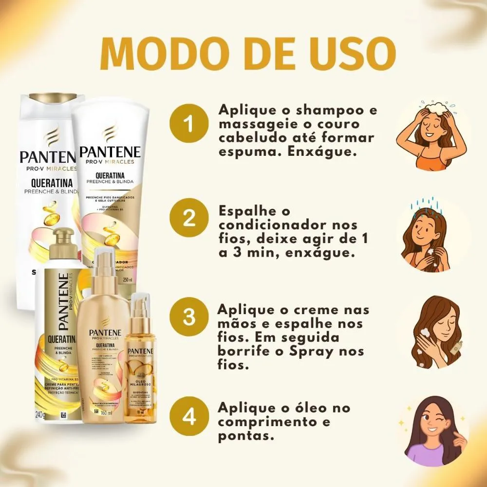 Como usar o Kit Pantene Pro-V Queratina: Shampoo 300Ml, Condicionador 250Ml, Creme Para Pentear 240G, Spray Multibenefícios 160Ml E Óleo Capilar 95Ml?