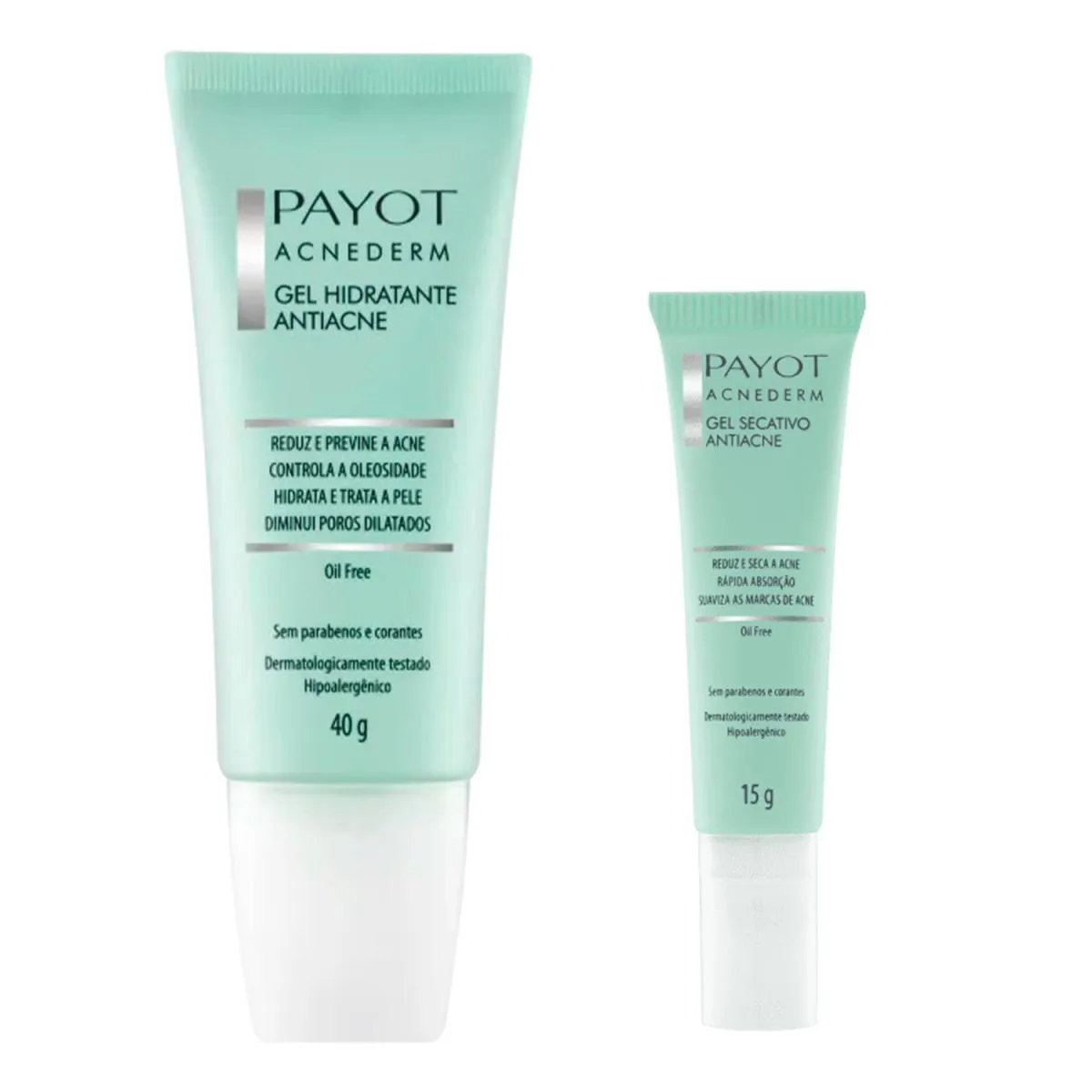 Payot Acnederm Gel Secativo 15g. Gel Secativo Antiacne Payot reduz o tamanho e a vermelhidão da acne. Previne a formação de novas espinhas. Possui ação refrescante que diminui a sensação de desconforto causado pela acne. Não resseca a pele. Fórmula leve enriquecida com Bisabolol, Óleo de Melaleuca, Niacinamida e Extrato de Romã, suaviza as marcas de acne e acalma a pele. Rápida absorção. Produto livre de fragrância, parabenos e corantes; Payot Acnederm Gel Hidratante Antiacne 40g. O Gel Hidratante Antiacne Payot, foi formulado com Pantenol e Óleo de Melaleuca, que conferem ação anti-inflamatória, calmante e antibacteriana. Reduz acne e espinhas. Hidrata sem deixar o rosto oleoso ou brilhante. Textura refrescante e de rápida absorção. Auxilia na prevenção das imperfeições e melhora o aspecto geral da pele.
