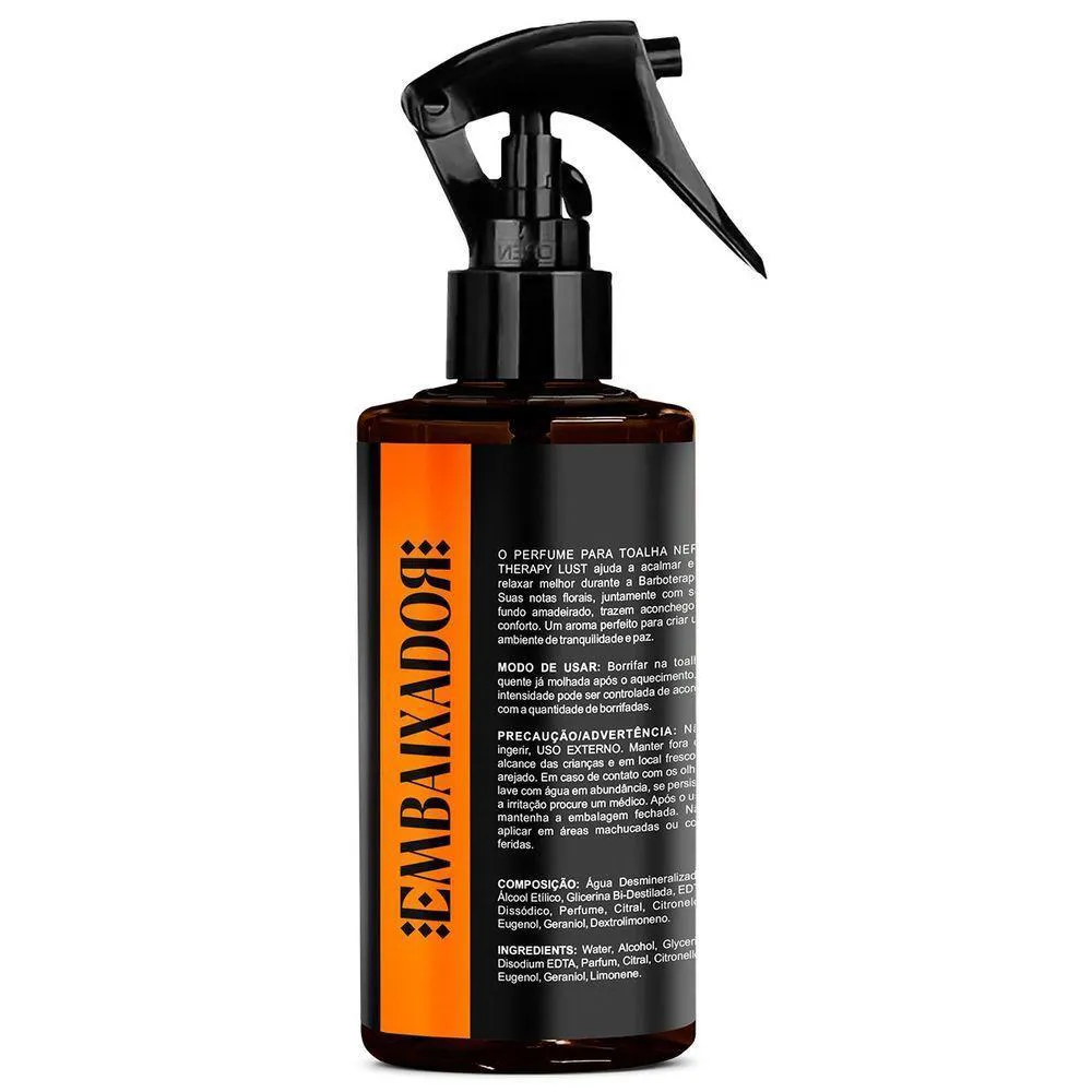 Perfume para Toalha Nerk Therapy Lust EmbaixadorO Perfume para Toalha Nerk Therapy Lust Embaixador, vai levar a barboterapia a um nível de sofisticação e prazer incomparáveis. Seu aroma especial foi criado para proporcionar aos seus clientes uma experiência sensorial única, envolvendo-os em uma atmosfera de luxo e bem-estar durante todo o processo de barbear. Com uma fragrância envolvente, o Perfume para Toalha Nerk Therapy Lust Embaixador é a combinação perfeita entre notas marcantes e sutis, que se entrelaçam para criar um perfume que desperta os sentidos e deixa uma impressão memorável.Com o objetivo de oferecer uma experiência luxuosa e relaxante durante a barboterapia. Cada aplicação do perfume nas toalhas traz uma sensação de conforto e exclusividade, transportando os clientes para um mundo de calma e prazer, onde os cuidados com a barba se tornam um momento especial de autoestima e autocuidado.Oferecer aos seus clientes a experiência do Perfume para Toalha Nerk Therapy Lust Embaixador é mais do que um toque de classe, é uma estratégia para fidelizar e conquistar novos clientes.