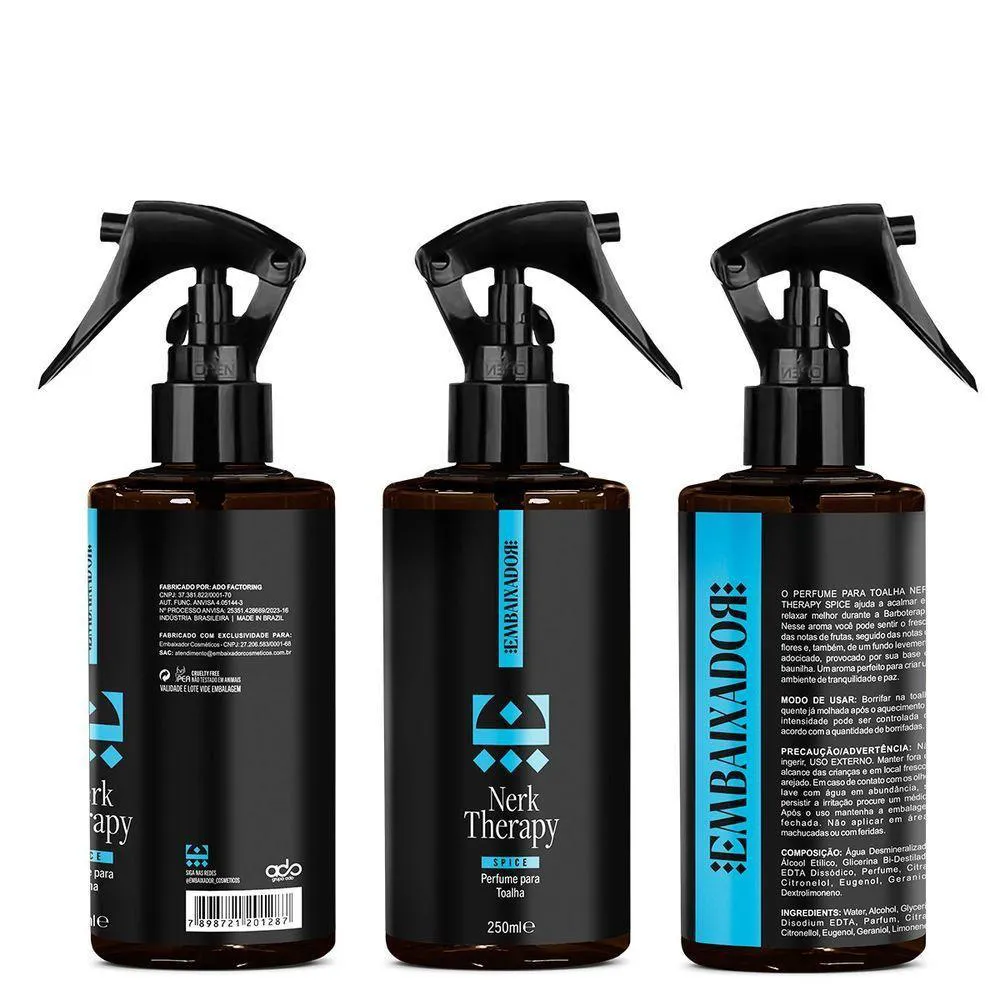 Perfume para Toalha Nerk Therapy Spice EmbaixadorPerfume para Toalha Nerk Therapy Spice Embaixador foi desenvolvido exclusivamente para elevar a experiência da barboterapia a outros patamares. Com uma fragrância que cativa os sentidos e envolve em uma jornada olfativa única, esse aroma especial irá transformar cada sessão de barbear em um momento de incríveis sensaçoes..O Perfume para Toalha Nerk Therapy Spice Embaixador é uma verdadeira sinfonia de notas aromáticas, onde o frescor das especiarias exóticas se harmonizam com a suavidade das notas amadeiradas e a elegância das notas orientais. Cada aplicação na toalha libera um perfume envolvente, criando uma atmosfera única e sofisticada na sua barbearia.Além de irresistível, o Perfume para Toalha Nerk Therapy Spice Embaixador oferece benefícios adicionais através da aromaterapia. As notas cuidadosamente selecionadas têm o poder de relaxar e acalmar a mente, transformando a barboterapia em um momento de renovação e tranquilidade para seus clientes.Sua barbearia merece o melhor, e o Perfume para Toalha Nerk Therapy Spice Embaixador é a escolha perfeita para elevar o padrão de excelência dos seus serviços. Ofereça aos seus clientes uma barboterapia inigualável, onde o cuidado com a barba se combina com uma experiência sensorial sofisticada e envolvente.