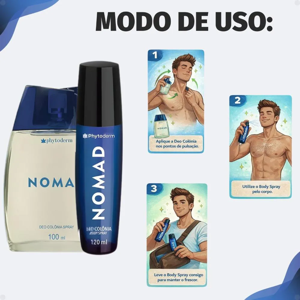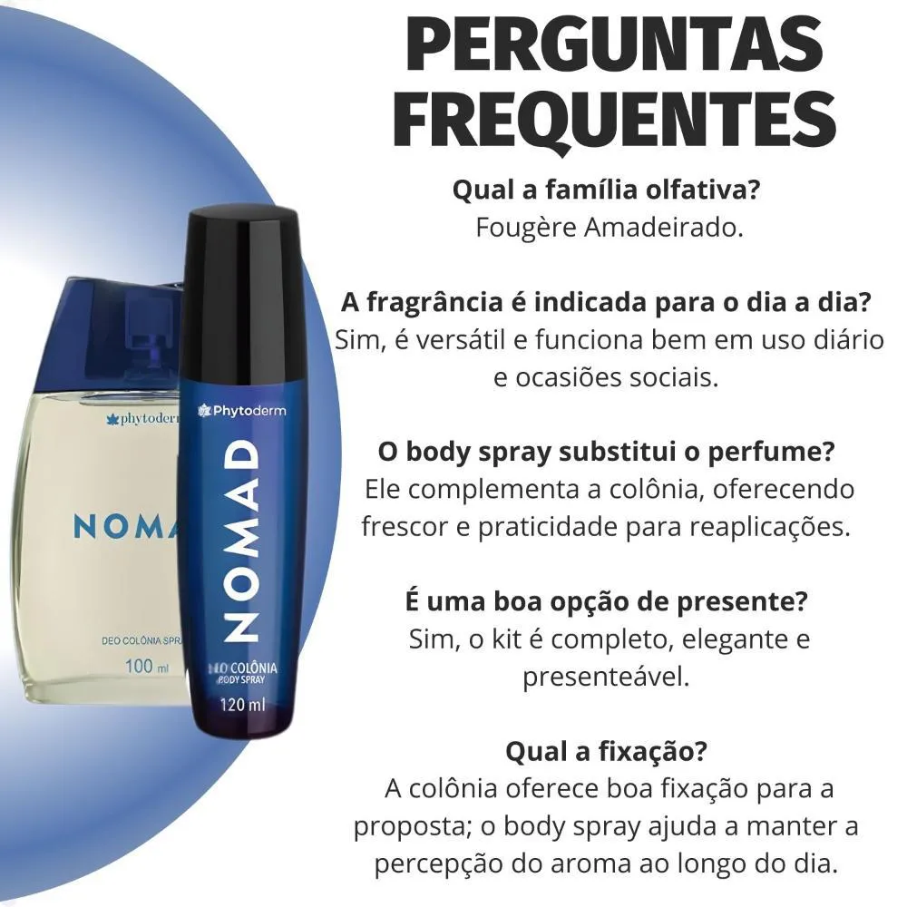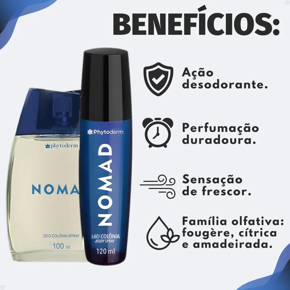 Contém: - 01 Deo Colônia Phytoderm Nomad 100ml. - 01 Deo Colônia Body Spray Phytoderm Nomad 120ml. O Kit Phytoderm Nomad é ideal para quem busca liberdade, aventura e sofisticação em uma fragrância marcante. Composto por uma Deo Colônia de 100ml e um Body Spray de 120ml, este kit oferece praticidade e versatilidade, perfeito para acompanhar você em todos os momentos do dia.A Deo Colônia Nomad 100ml apresenta uma fragrância envolvente e equilibrada, combinando notas frescas e aromáticas com um toque amadeirado, transmitindo energia, liberdade e personalidade. É perfeita para quem deseja deixar uma impressão marcante e duradoura, seja em encontros sociais, no trabalho ou em passeios. O Body Spray 120ml proporciona aplicação rápida e uniforme, garantindo uma sensação refrescante e prolongando a durabilidade do aroma no corpo. Seu formato prático permite que você leve a fragrância para qualquer lugar, mantendo o estilo e a elegância a qualquer momento. Este kit é uma excelente opção de presente para quem valoriza experiências únicas e aromas sofisticados. Com o Kit Phytoderm Nomad, cada dia se torna uma nova aventura, acompanhada de um perfume que expressa liberdade, confiança e autenticidade.Benefícios Principais