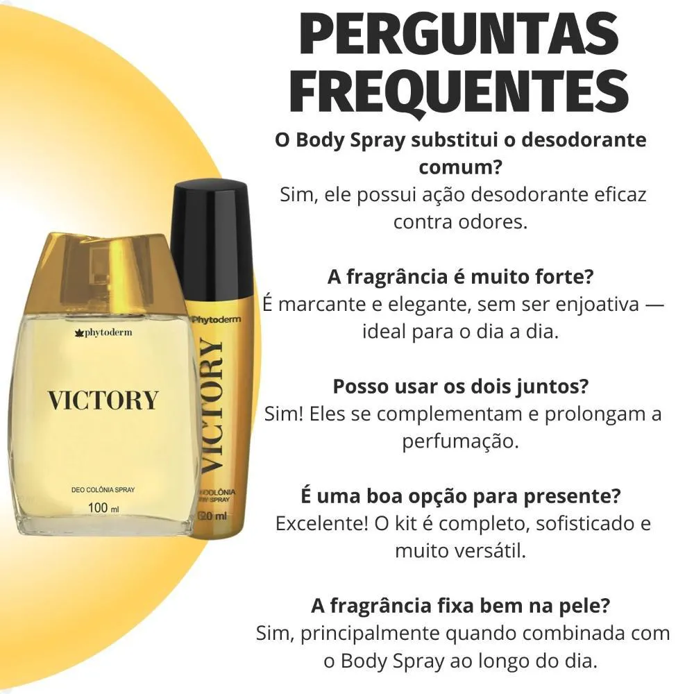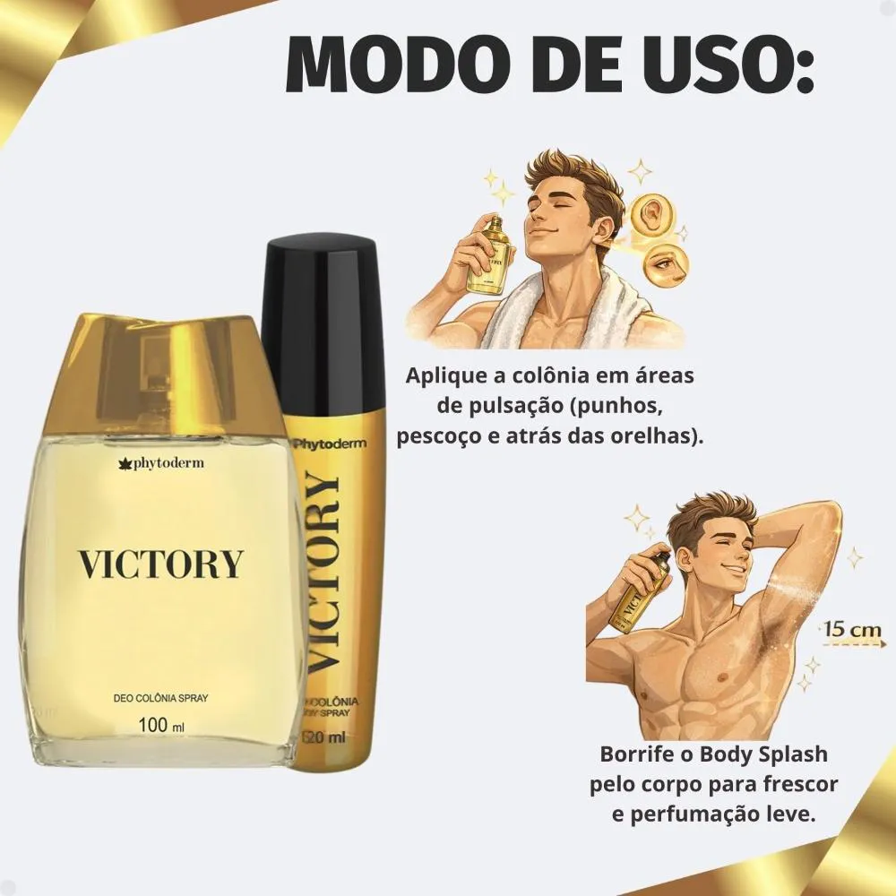 - Essência de Confiança: A fragrância Victory, com suas notas de menta, canela, flor de laranjeira, vanilla e madeiras nobres, realça sua personalidade poderosa e confiante.