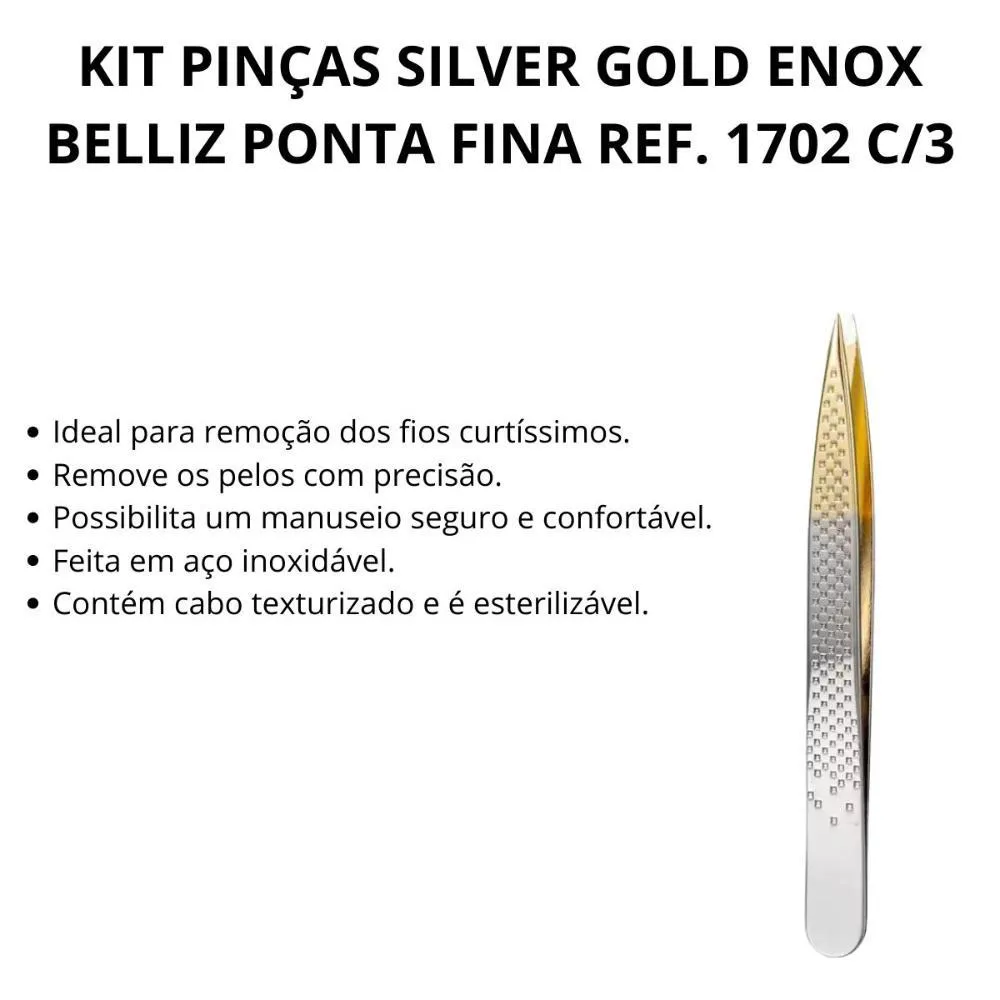 Kit Pinças Silver Gold Enox Belliz Ponta Fina Ref. 1702 C/3