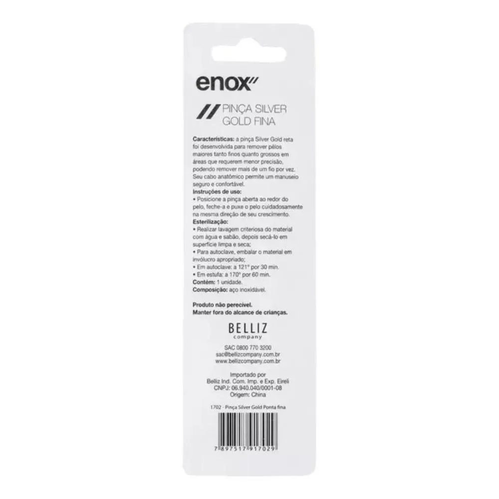 Contém: - 03 Pinças Silver Gold Enox Belliz Ponta Fina Ref:1702. . Pinça Silver Gold Ponta Fina Pinça de ponta fina para remoção de pelos. Enox Silver Gold Fina é ideal para os fios curtíssimos, pois remove com precisão. Com Enox Silver Gold Fina, você consegue retirar os pelos um a um, inclusive os mais curtos e finos. Enox Silver Gold Fina é útil para desenhar formatos de sobrancelhas, uma vez que você pode retirar um único pelinho por vez, com total controle. . Modo de Uso Segure o fio entre os dentes da pinça, pressione e puxe no sentido do crescimento. Sempre limpe-a com um algodão embebido em álcool, antes e depois da utilização.
