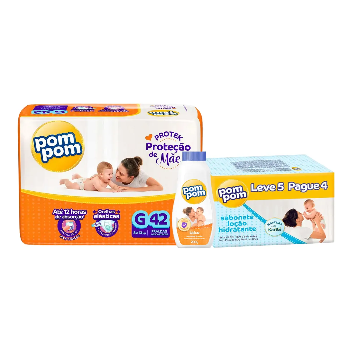 Kit Pom Pom Fralda Protek Proteção de Mãe G 42 unidades + Talco Infantil 200g + Sabonete em Barra Loção Hidratante 80g 5 unidades