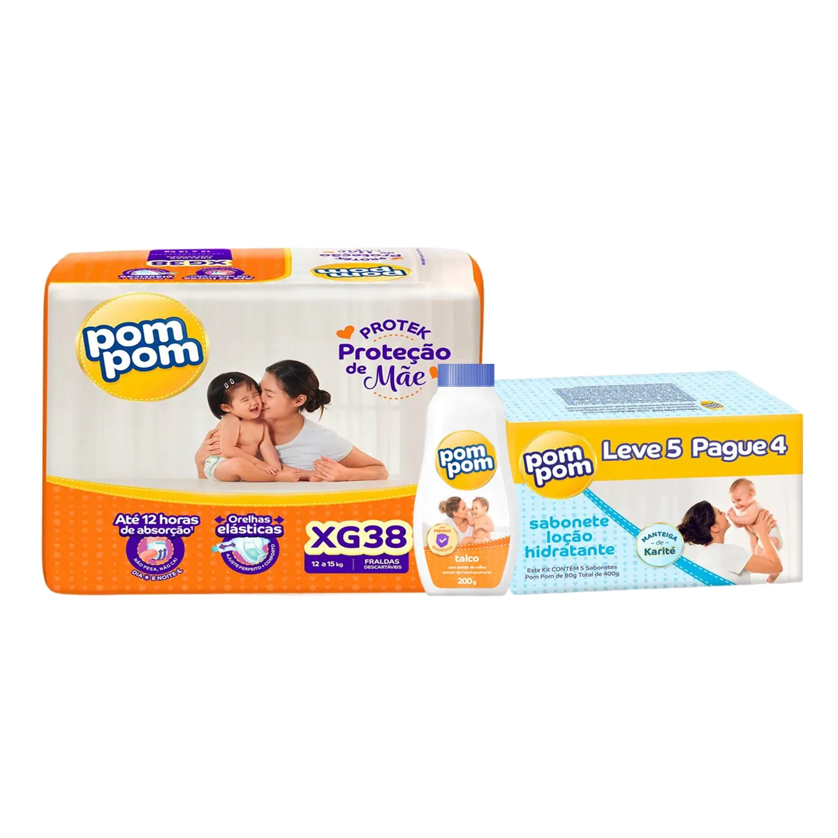 Kit Pom Pom Fralda Protek Proteção de Mãe XG 38 unidades + Talco Infantil 200g + Sabonete em Barra Loção Hidratante 80g 5 unidades