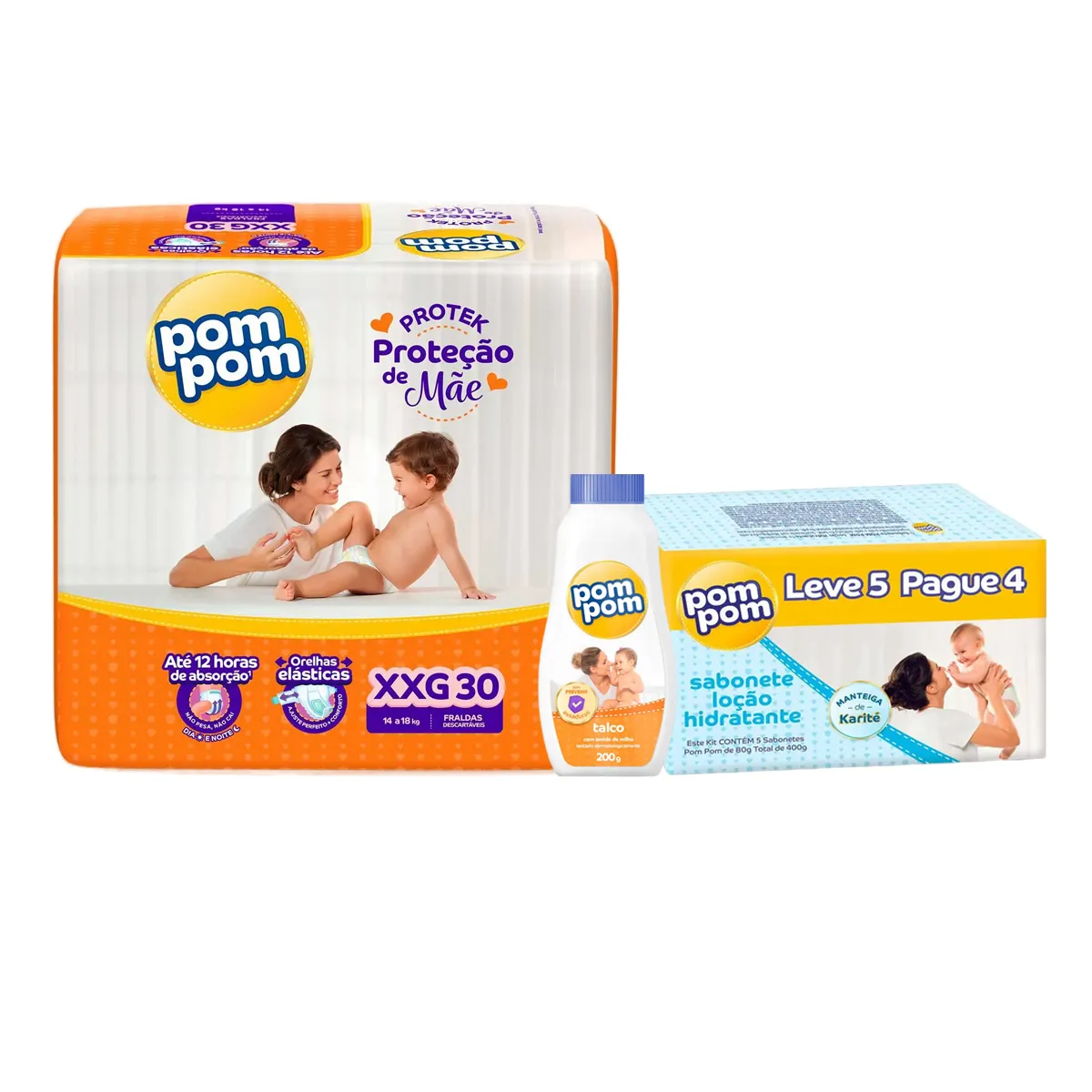 Kit Pom Pom Fralda Protek Proteção de Mãe XXG 30 unidades + Talco Infantil 200g + Sabonete em Barra Loção Hidratante 80g 5 unidades