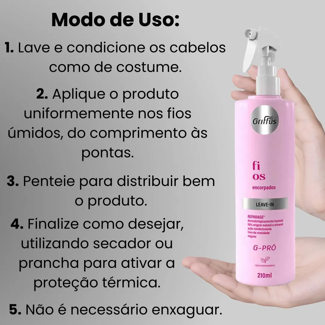 1x Leave-In Griffus G-Pró Fios Encorpados 210ml Nota do fabricante: É comum que aparelhos elétricos novos liberem uma leve fumaça ou gases durante as primeiras vezes em que eles forem utilizados. Isso acontece em virtude do aquecimento dos materiais e dos componentes usados na manufatura do aparelho. É normal e não indica a existência de defeitos no aparelho. Parte superior do formulário Parte inferior do formulário