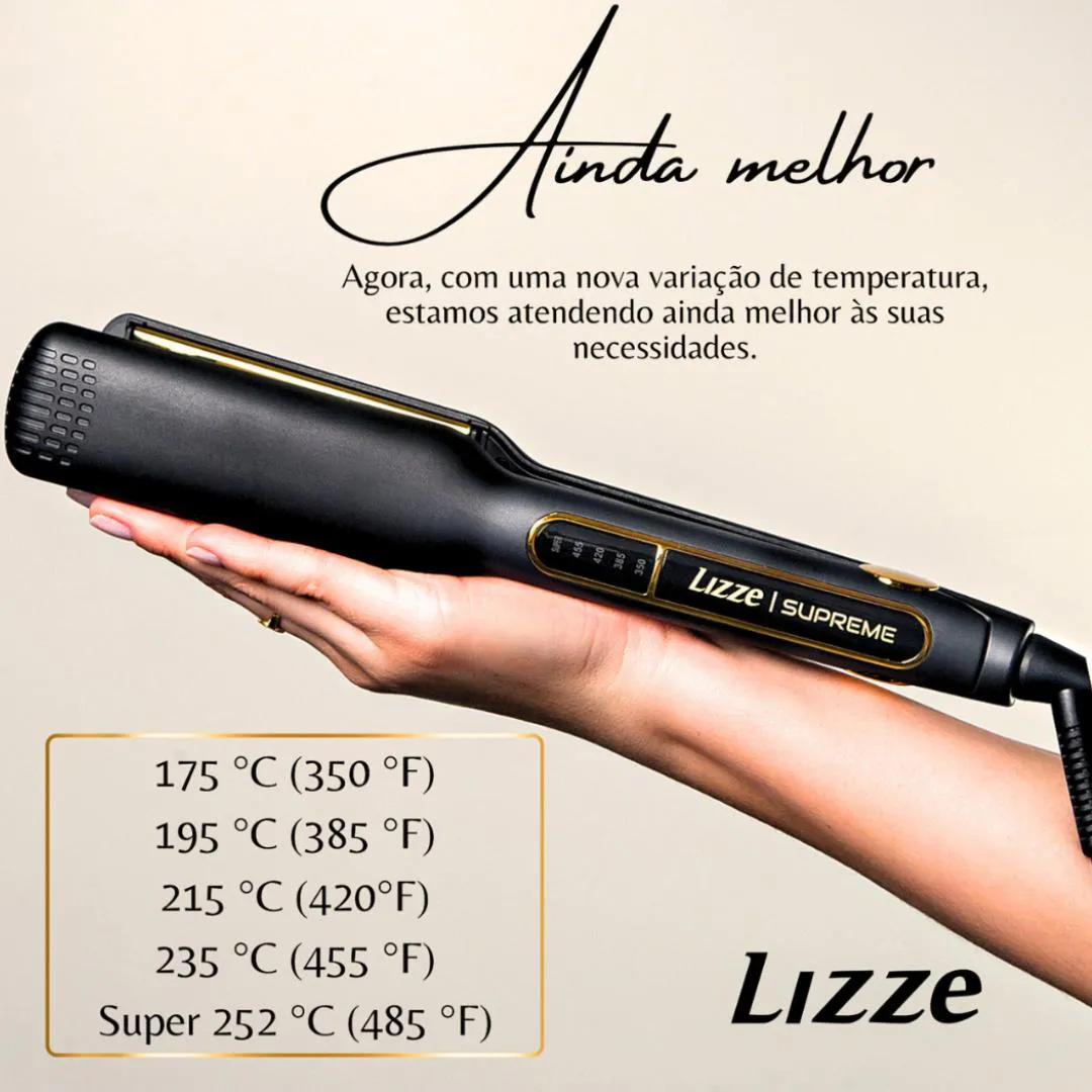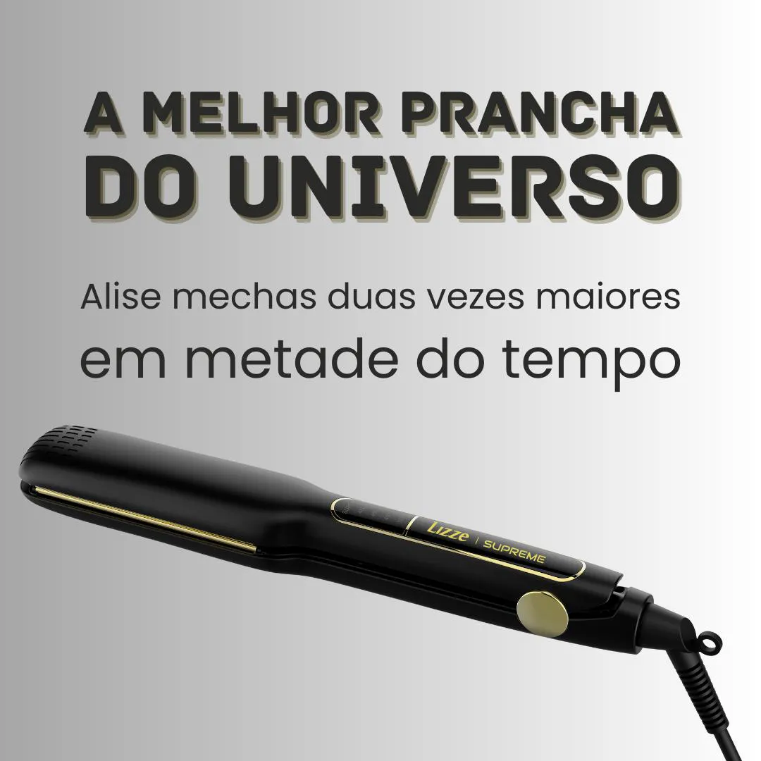 ALISAMENTO RÁPIDO E PERFEITO: PRANCHA LIZZE SUPREME COM TECNOLOGIA NANO TITÂNIO! A Prancha para cabelo Lizze Supreme é um equipamento profissional desenvolvido para alisamento rápido e eficiente, ideal para salões e uso doméstico. Com placas de titânio de 40mm e temperatura máxima de 252°C (485°F), a prancha reduz o tempo de trabalho pela metade, permitindo alisar mechas maiores em menos passadas. A tecnologia Nano Titanium garante distribuição uniforme de calor, evitando danos aos fios e proporcionando acabamento liso e brilhante. O design inclui um visor LED e teclas intuitivas para controle preciso da temperatura, adaptando-se a diferentes tipos de cabelo. O gabinete é resistente a desgastes, mantendo a estética original mesmo após uso prolongado. A prancha também possui resistências de cerâmica, que mantêm o calor constante durante o uso, garantindo resultados profissionais. Segura e certificada pelo INMETRO, a Lizze Supreme é adequada para todos os tipos de cabelo, incluindo quimicamente tratados, e vem com manual de instruções, certificado de garantia de 6 meses e acessórios de limpeza. - Placas de titânio de 40 mm: Alisam o dobro de cabelo por passada, reduzindo o tempo de trabalho.