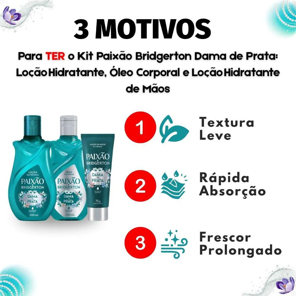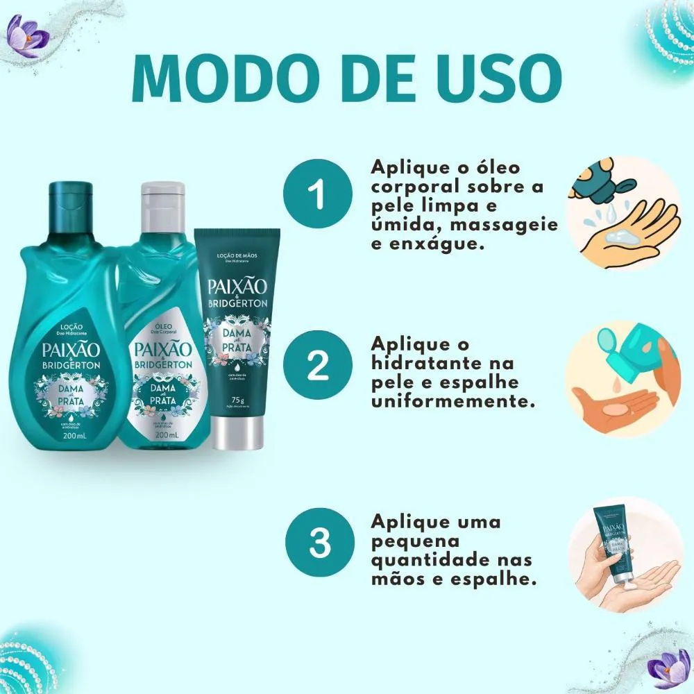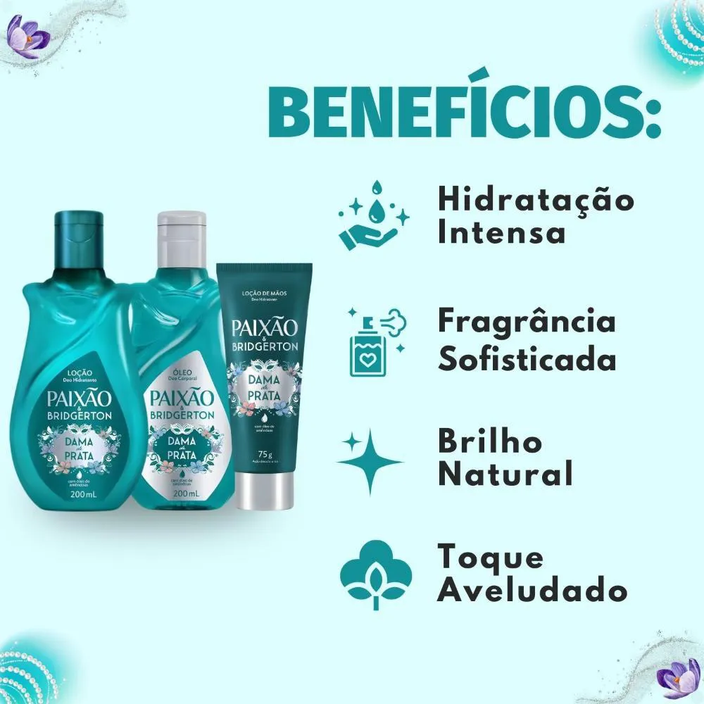 Kit Presente Paixão Bridgerton Dama de Prata: Loção Hidratante, Óleo Corporal 200ml e Loção Hidratante de mãos 75g