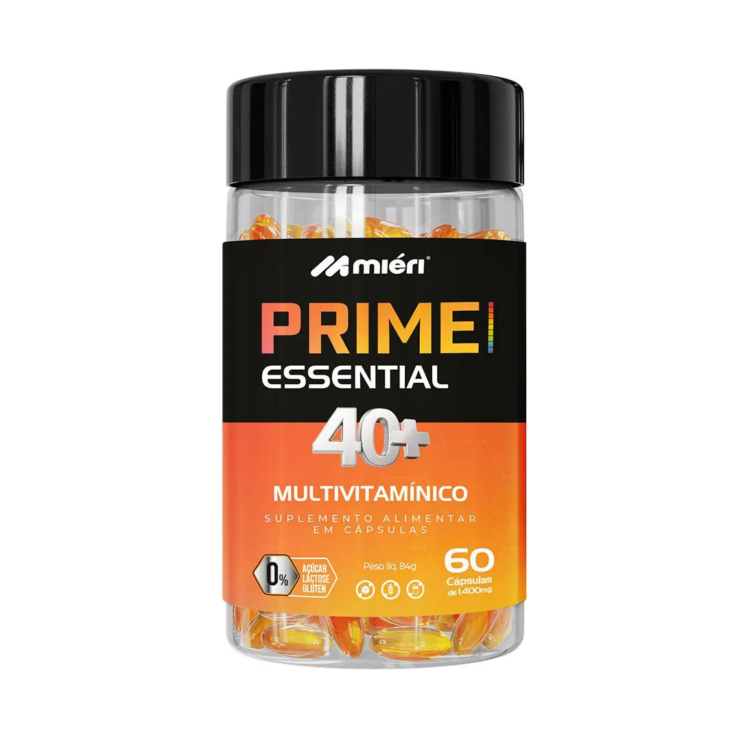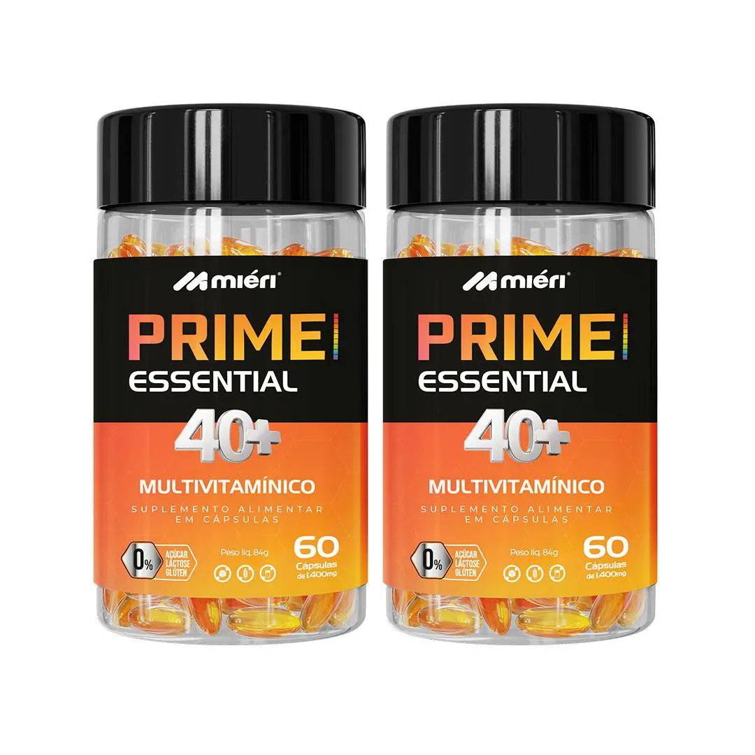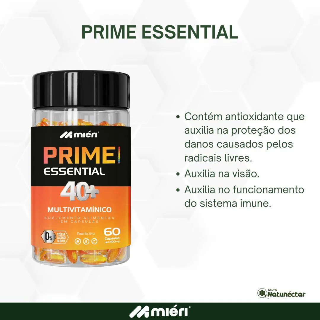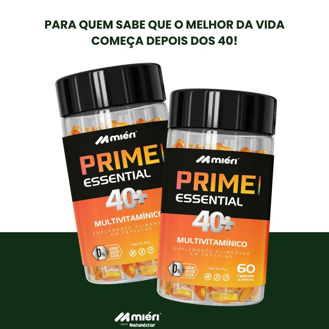 Kit Prime Essential Multivitamínico 40+ Miéri - 2 unid (120 cápsulas) O kit contém: 02 Frascos de Prime Essential Multivitamínico 40+ Miéri de 60 cápsulas O Prime Essential 40+ é o multivitamínico completo da Mieri, especialmente desenvolvido para quem já passou dos 40 e quer manter a imunidade e a qualidade de vida sempre em alta. Sua fórmula equilibrada foi pensada para atender às necessidades do organismo maduro, reforçando o aporte de vitaminas e minerais essenciais ao longo do dia. Benefícios: Contém antioxidante que auxilia na proteção dos danos causados pelos radicais livres. Auxilia no funcionamento do sistema imune. Auxilia na visão. Modo de usar: tomar 1 cápsulas 2 vezes ao dia. Precauções: Este produto não é um medicamento. Não exceder a recomendação diária de consumo indicada na embalagem. Mantenha fora do alcance de crianças. Produto indicado para grupo populacional ≥ de 19 anos. Este produto não deve ser consumido por gestantes, lactantes e crianças. Ingredientes: Óleo de Semente de Abóbora (família curcubitaceae), Óleo de Girassol ( helianthus annuus l.), Acetato de Dl - Aalfa - Tocoferol (vitamina e), Bisglicinato de Zinco, Selenito de sódio (selênio) e Licopeno de tomate. Composição da cápsula: gelatina, Água purificada, umectante glicerina e agente de massa sorbitol. Alérgicos: pode conter derivados de peixe. Não contém glúten. Produto dispensado de registro de acordo com a Resolução RDC nº Nº 23/00, 240/18 E 27/10– ANVISA PRODUTO DO GRUPO NATUNÉCTAR