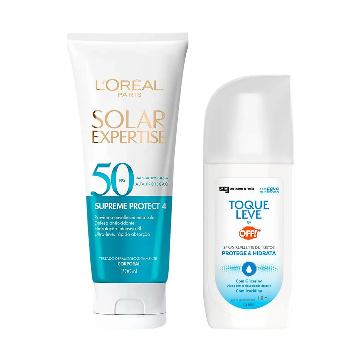 O Kit Protetor Solar Corporal FPS 50 L'Oreal Solar Expertise Supreme + Repelente de Insetos Off! Protege e Hidrata Toque Leve Sem Perfume com Icaridina Spray é um conjunto que oferece proteção solar avançada contra os raios UVA e UVB, além de repelência eficaz contra mosquitos e outros insetos. O protetor solar possui tecnologia exclusiva Mexoryl X4 que previne o envelhecimento e o aparecimento de manchas solares, enquanto o repelente contém icaridina 10% para garantir até 6 horas de proteção contra picadas.