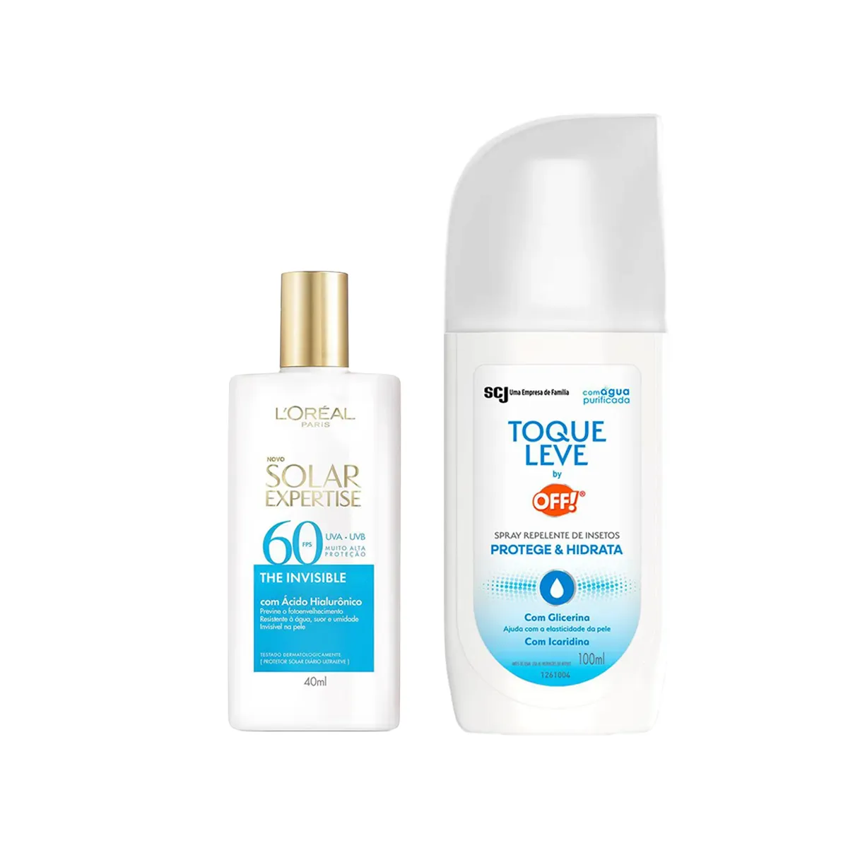 O Kit Protetor Solar Facial L'Oréal Paris Solar Expertise The Invisible + Repelente de Insetos Off! Protege e Hidrata Toque Leve Sem Perfume com Icaridina Spray é um conjunto composto por um protetor solar facial diário antienvelhecimento e um repelente de insetos com icaridina 10%, desenvolvidos para proteger a pele dos raios UV e prevenir picadas de mosquitos, incluindo transmissores de doenças como dengue, zika e chikungunya.