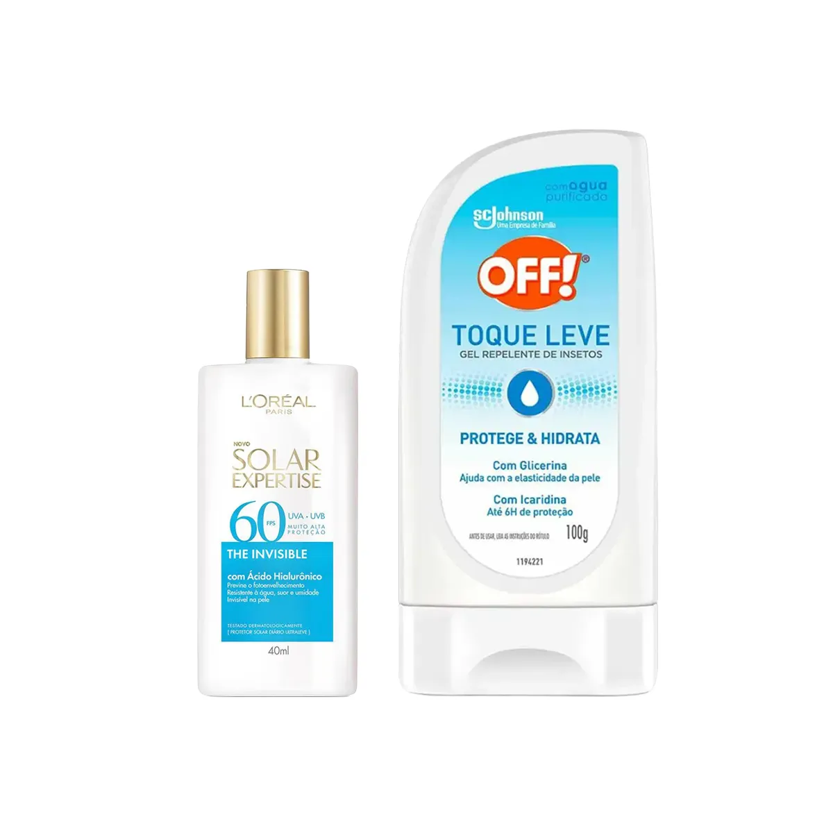 O Kit Protetor Solar Facial L'Oréal Paris Solar Expertise The Invisible + Repelente de Insetos Off! Toque Leve Icaridina Gel é um conjunto composto por um protetor solar facial com FPS 60 e um gel repelente de insetos. O protetor solar L'Oréal Paris Solar Expertise é um produto antienvelhecimento com fórmula aquosa, textura ultraleve e enriquecida com ácido hialurônico, que oferece tripla resistência contra água, suor e umidade. O repelente de insetos Off! Toque Leve é um gel feito com água purificada, glicerina e icaridina, com fórmula não oleosa e sem perfume, que protege e hidrata a pele, repelindo até mesmo o mosquito da Dengue, Zika Vírus e da febre Chikungunya.