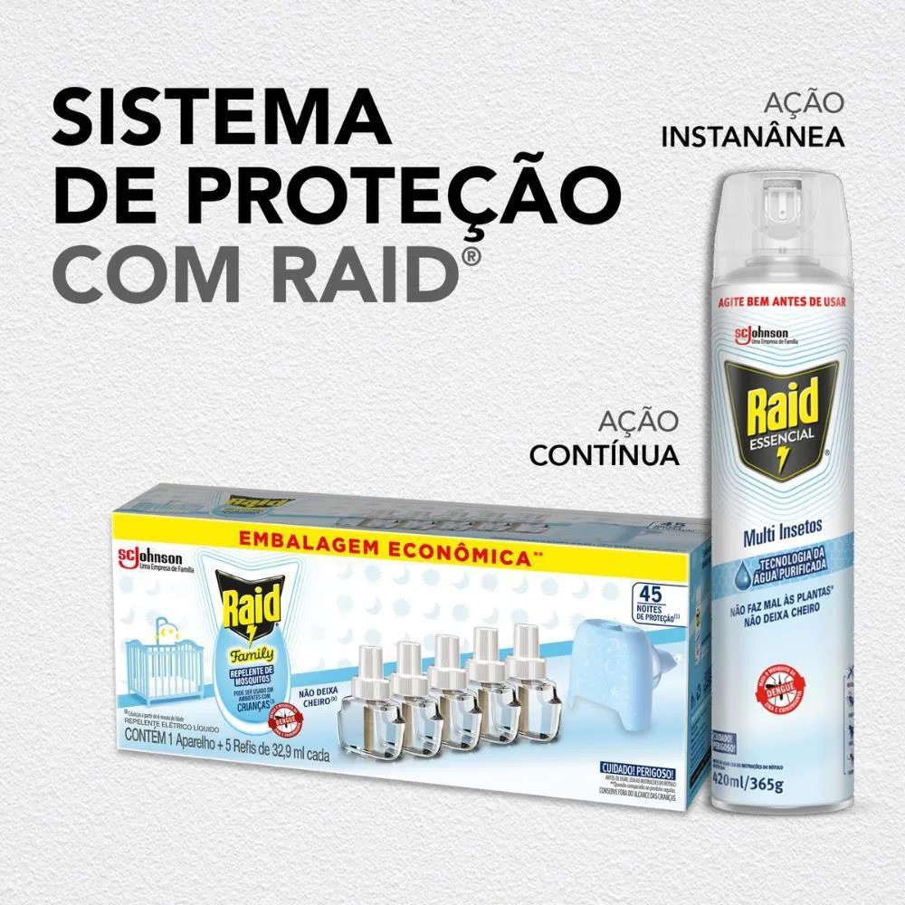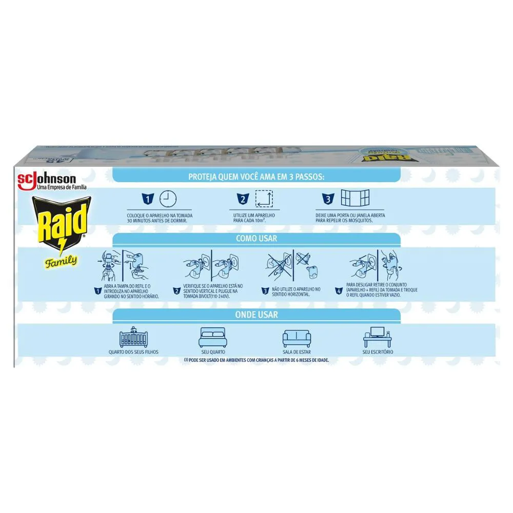 O Kit Raid Family é um conjunto de repelente elétrico composto por um aparelho e cinco refis, desenvolvido para proteção contra mosquitos em ambientes domésticos. Serve para afastar mosquitos de forma gradual e contínua, oferecendo proteção por até 45 noites por refil, sendo seguro para uso em ambientes com crianças e sem deixar cheiro, mantendo quartos e salas livres de insetos de forma prática e eficiente.