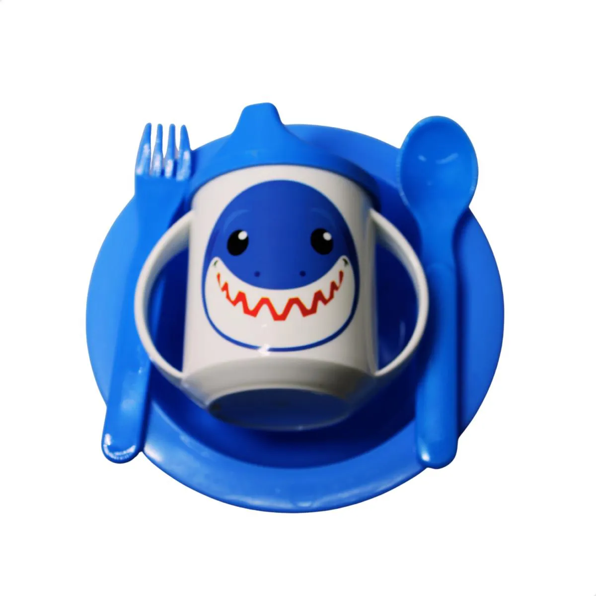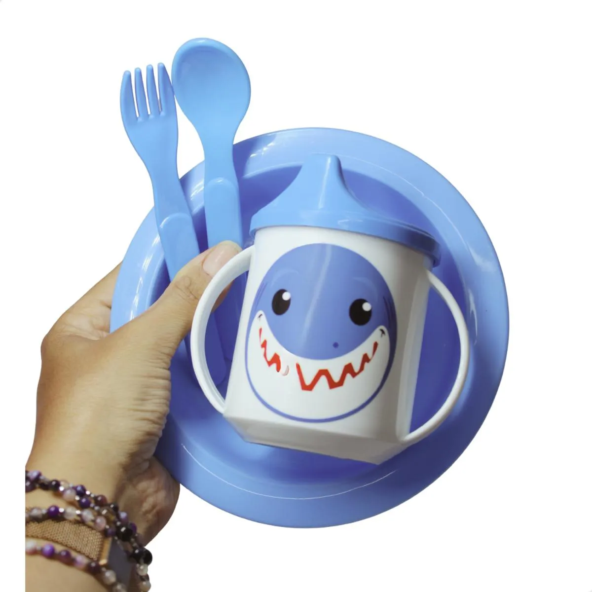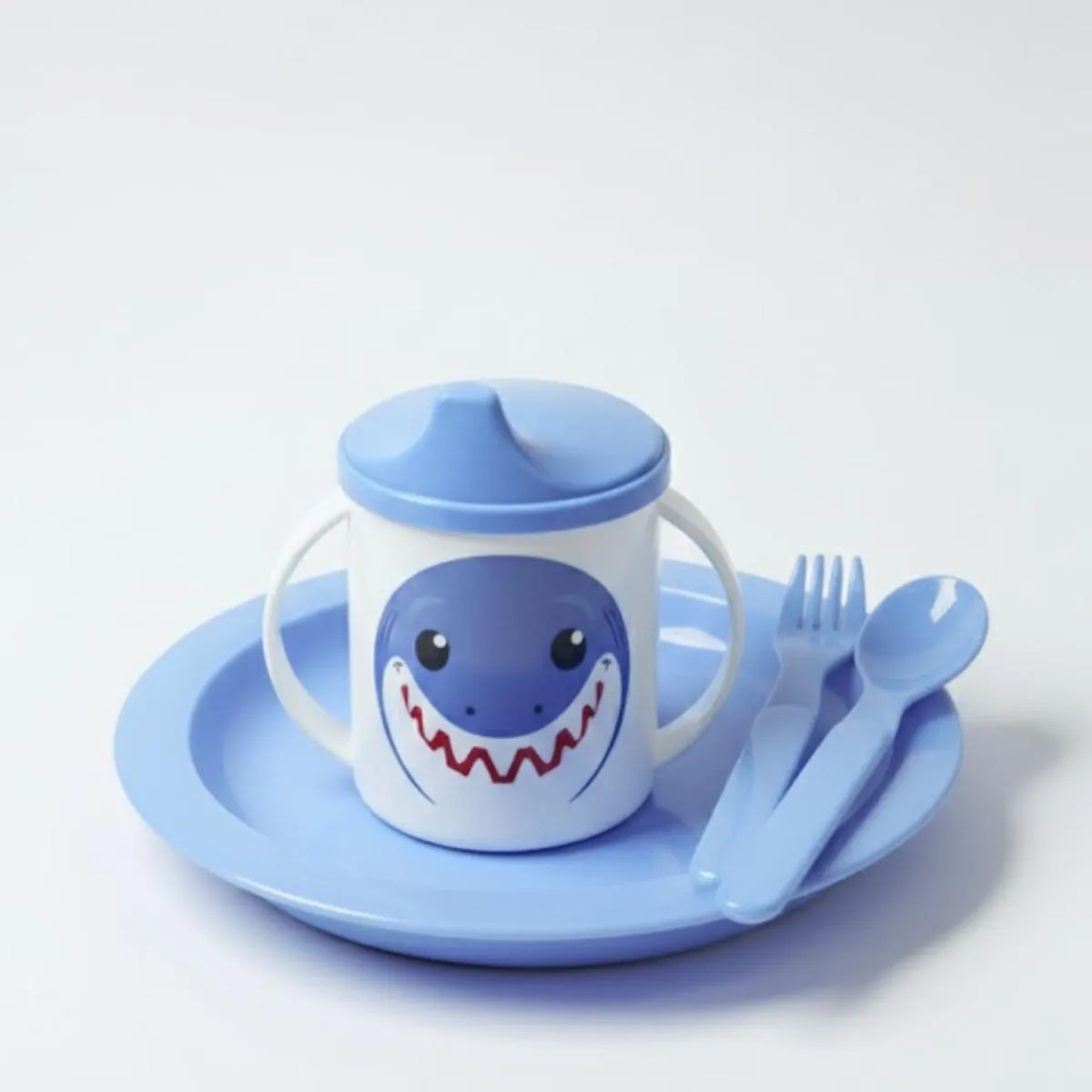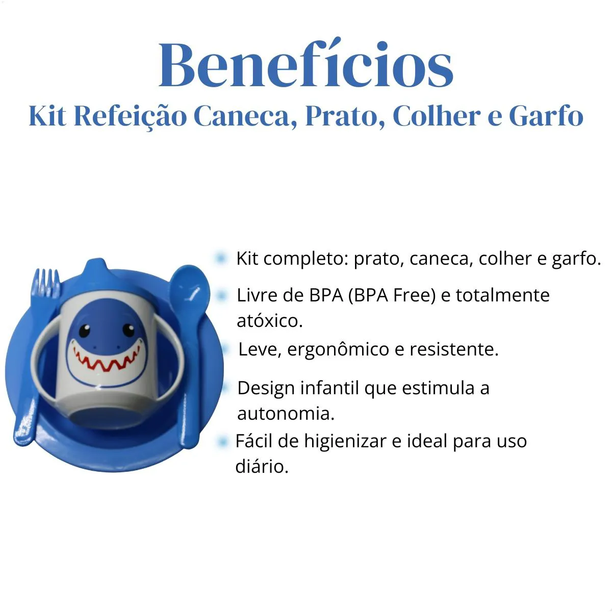 - Kit completo com prato, caneca, colher e garfo para alimentação infantil.