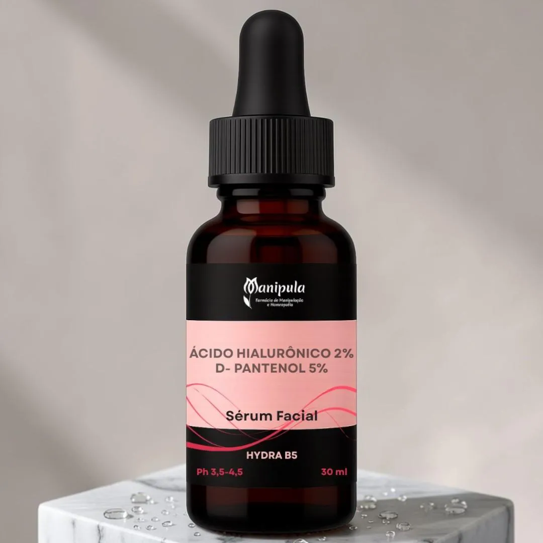 Aplicar fina camada na face à noite, limpando suavemente O Hydra B5 SkinLab Manipula é um sérum facial hidratante desenvolvido para promover hidratação profunda e auxiliar na recuperação da barreira natural da pele. Sua fórmula combina ácido hialurônico e pantenol (vitamina B5), ativos amplamente utilizados na dermatologia e na cosmetologia por sua capacidade de reter água na pele e melhorar a elasticidade. O ácido hialurônico possui alta capacidade de retenção de água, contribuindo para manter a pele hidratada, macia e com aparência mais saudável. Já o pantenol auxilia na recuperação da pele, ajudando a fortalecer a barreira cutânea e melhorar a textura da pele. Com textura leve e rápida absorção, o Hydra B5 pode ser utilizado diariamente na rotina de skincare e é indicado para todos os tipos de pele, especialmente peles desidratadas ou sensibilizadas. A linha SkinLab Manipula foi desenvolvida para oferecer dermocosméticos de alta performance com ativos reconhecidos pela dermatologia moderna. Comprar na Farmácia Manipula é sinônimo de confiança e qualidade. São mais de 23 anos de experiência no mercado magistral e mais de 8 milhões de fórmulas produzidas, garantindo produtos manipulados com procedência assegurada e alto padrão farmacêutico. Propriedades: • hidratação profunda da pele