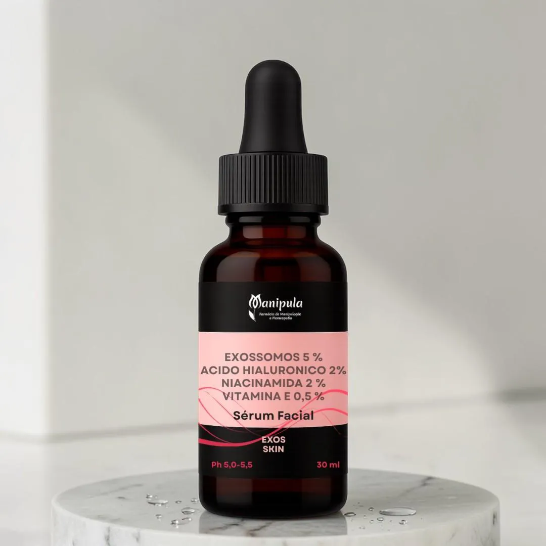 PDRN (DNA do Salmão) 0,5 % +ACIDO HIALURONICO 2 % - Sérum facial qsp O Exos Skin SkinLab Manipula é um sérum de última geração desenvolvido com exossomos biomiméticos, tecnologia avançada da dermatologia regenerativa voltada para comunicação celular, renovação da pele e melhora global dos sinais do envelhecimento. Os exossomos são estruturas naturais responsáveis pela comunicação entre células, transportando sinais biológicos essenciais para o funcionamento da pele. Com o envelhecimento, essa comunicação se torna menos eficiente, impactando diretamente a regeneração e a qualidade do tecido cutâneo. A tecnologia EXOS utilizada neste sérum foi desenvolvida para restaurar essa comunicação celular, promovendo um ambiente mais favorável para renovação, reparo e funcionalidade da pele. Sua fórmula contém uma combinação avançada de peptídeos com ação semelhante a fatores de crescimento, ácido hialurônico, niacinamida e antioxidantes biomiméticos, proporcionando um cuidado completo e altamente tecnológico. Entre seus principais diferenciais está o estímulo à produção de colágeno e fortalecimento da matriz extracelular, além de auxiliar no controle de processos inflamatórios relacionados ao envelhecimento (“inflammaging”). Com uso contínuo, o Exos Skin se posiciona como um dos séruns mais avançados da linha, indicado para quem busca um cuidado premium, com foco em rejuvenescimento, firmeza e vitalidade da pele. A linha SkinLab Manipula reúne ativos consagrados na dermatologia moderna para oferecer dermocosméticos de alta performance e qualidade farmacêutica. Propriedades: • auxilia na comunicação celular da pele