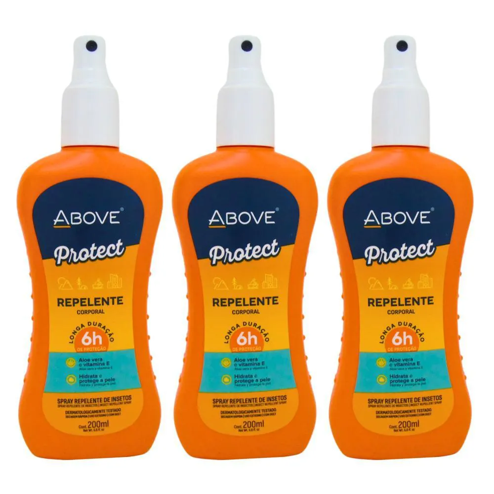 Contém: - 03 repelentes Corporais Above Protect 200ml. . Repelente Corporal Protect O Repelente Corporal Protect protege contra a ação de pernilongos, borrachudos e mosquitos, incluindo o Aedes aegypti, transmissor da dengue, febre amarela, zika e chikungunya. Fácil de aplicar, tem secagem rápida e ação duradoura de 6 horas. O repelente é de fácil aplicação e não tem textura oleosa. Com Aloe Vera e vitamina e que hidrata e protege a pele. Dermatologicamente testado. Não testado em animais. . Modo de Uso Com o corpo seco, aplique o Repelente uniformemente nas áreas desejadas do corpo. Para aplicação no rosto, coloque o repelente nas mãos e, então, espalhe o produto na face, evitando o contato com olhos e bocas. Lave as mãos com água e sabão logo em seguida. Reaplique o Repelente de 6 em 6 horas nas áreas expostas. Não aplique o produto por baixo da roupa. . Composição Alcool, dietil tuloamida, glicerol, óleo de semente de andiroba, acetato de tocoferila, bht, propilenoglicol, extrato de aloe vera, agua, perfume, linalol, benzyl salicilate, alpha-isomethyl ionone, citronellol, coumarin, geraniol.