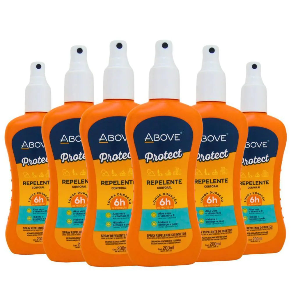 Contém: - 06 repelentes Corporais Above Protect 200ml. . Repelente Corporal Protect O Repelente Corporal Protect protege contra a ação de pernilongos, borrachudos e mosquitos, incluindo o Aedes aegypti, transmissor da dengue, febre amarela, zika e chikungunya. Fácil de aplicar, tem secagem rápida e ação duradoura de 6 horas. O repelente é de fácil aplicação e não tem textura oleosa. Com Aloe Vera e vitamina e que hidrata e protege a pele. Dermatologicamente testado. Não testado em animais. . Modo de Uso Com o corpo seco, aplique o Repelente uniformemente nas áreas desejadas do corpo. Para aplicação no rosto, coloque o repelente nas mãos e, então, espalhe o produto na face, evitando o contato com olhos e bocas. Lave as mãos com água e sabão logo em seguida. Reaplique o Repelente de 6 em 6 horas nas áreas expostas. Não aplique o produto por baixo da roupa. . Composição Alcool, dietil tuloamida, glicerol, óleo de semente de andiroba, acetato de tocoferila, bht, propilenoglicol, extrato de aloe vera, agua, perfume, linalol, benzyl salicilate, alpha-isomethyl ionone, citronellol, coumarin, geraniol.