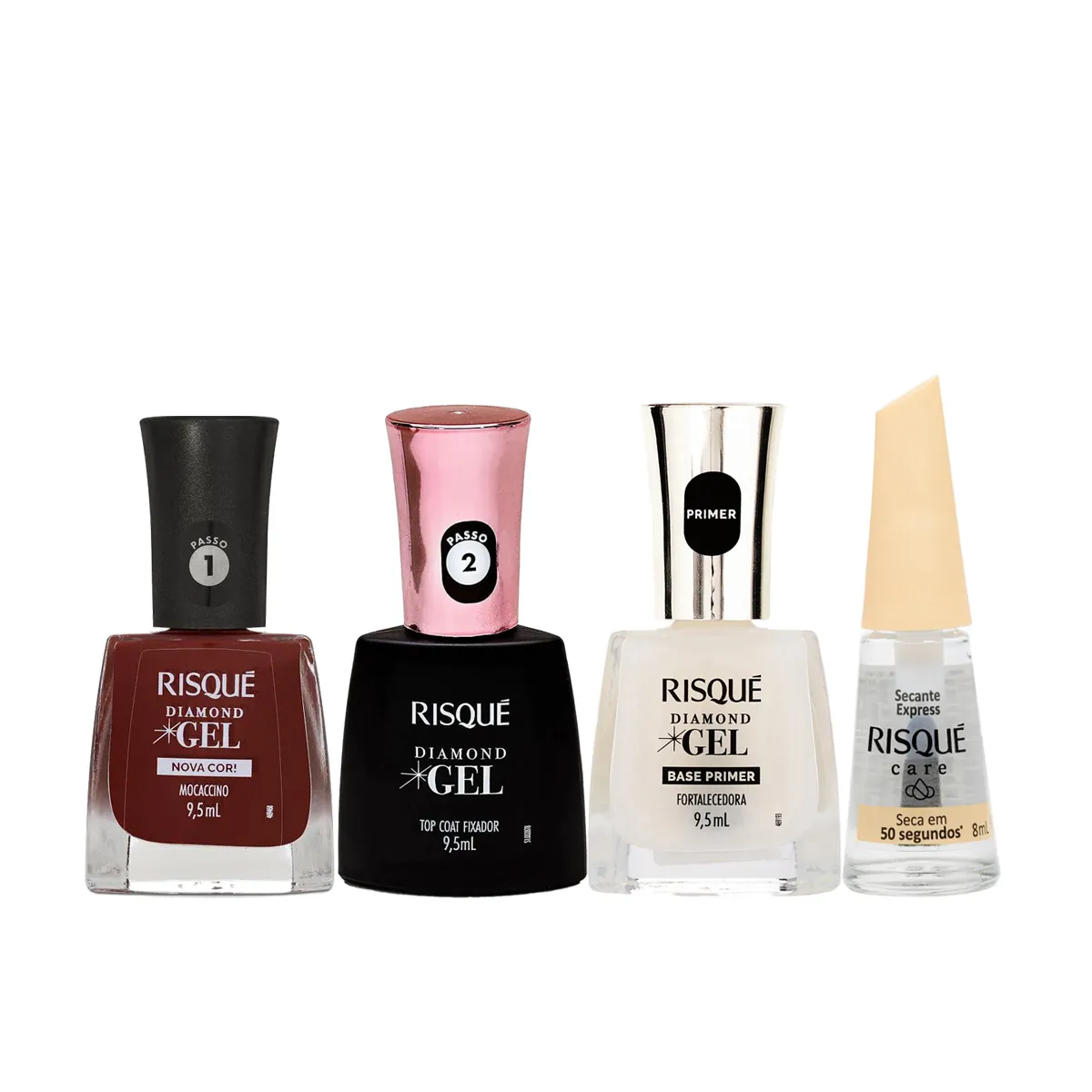 Kit Risqué Diamond Gel Base Primer Fortalecedora 9,5ml + Top Coat Fixador 9,5ml + Esmalte Mocaccino 9,5ml + Secante Express 8ml