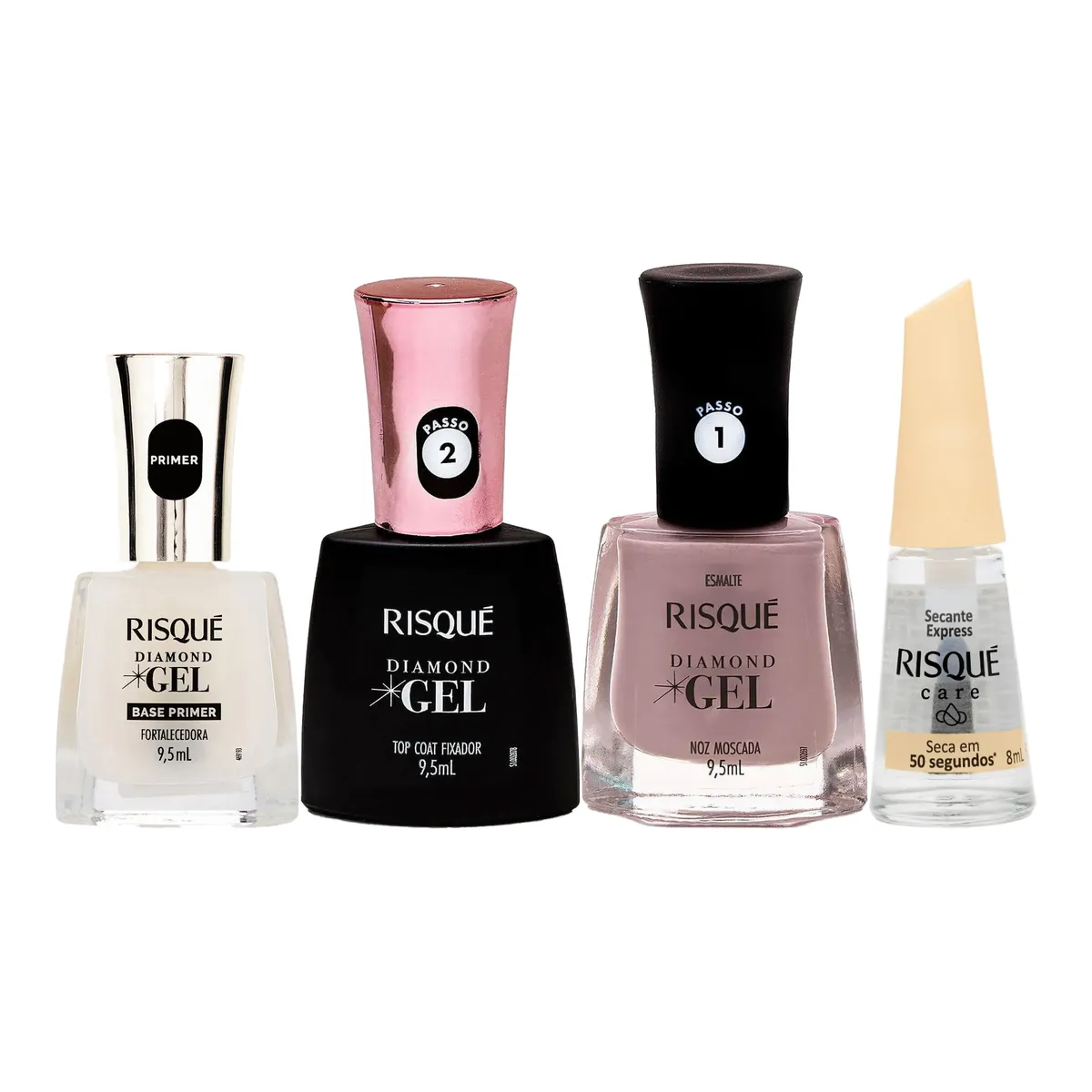 Kit Risqué Diamond Gel Base Primer Fortalecedora 9,5ml + Top Coat Fixador 9,5ml + Esmalte Noz Moscada 9,5ml + Secante Express 8ml