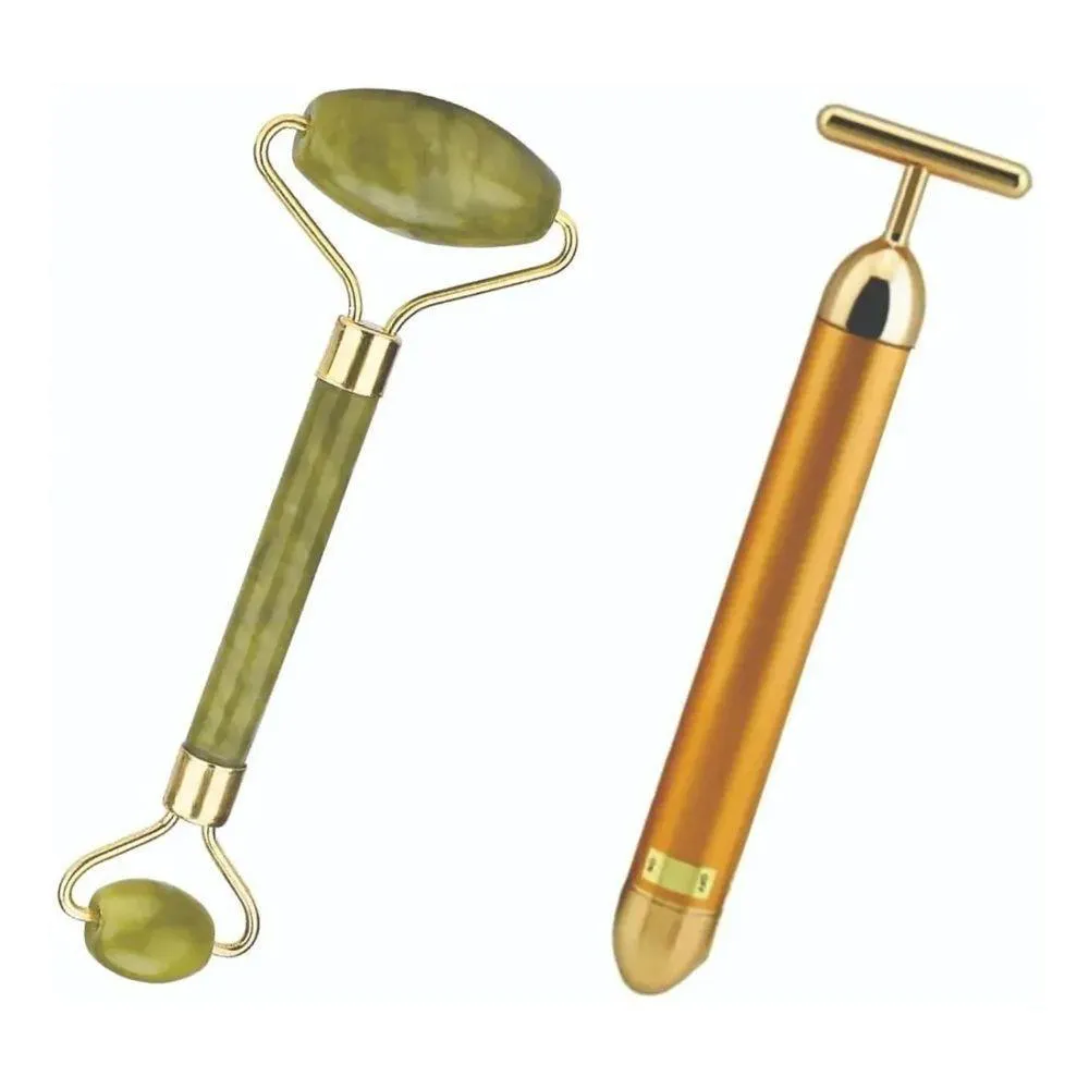 Kit Rolo Facial Pedra De Jade Rolo Verde + Massageador T Gold 24k Vibrata Anti Rugas Idade Firma A Pele E Rejuvenesce